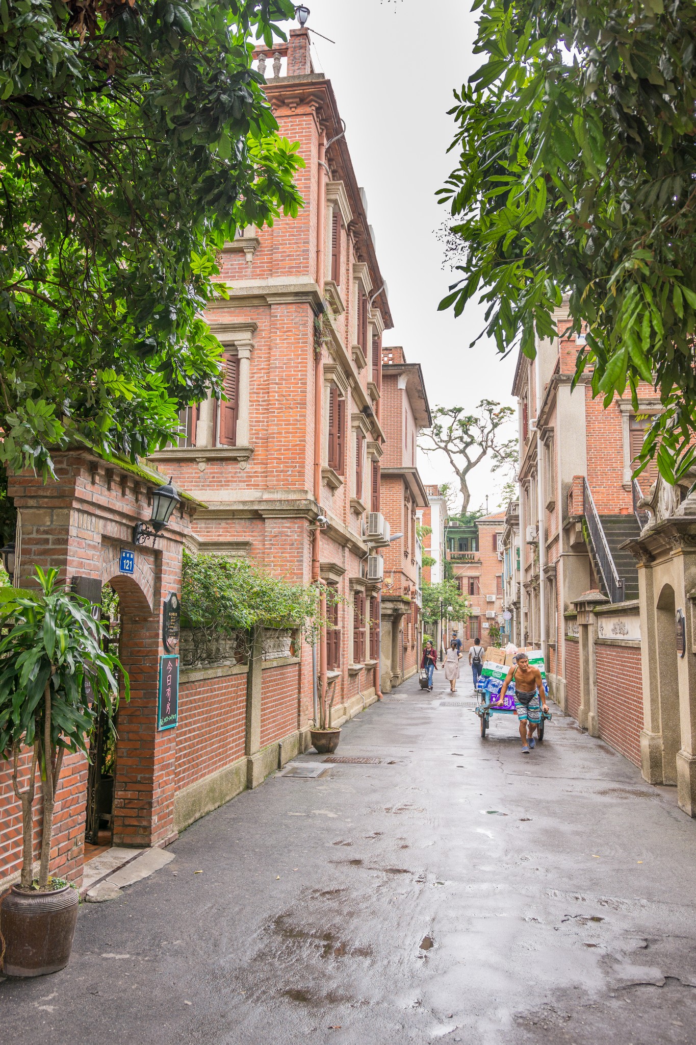 鼓浪屿上没有汽车,且全是山路,不论是游客还是岛上的居民,出行都得靠步行。大雨渐停,拖着行李箱的游客,拉着板车送货的伙计,穿梭在湿漉漉的街道上。