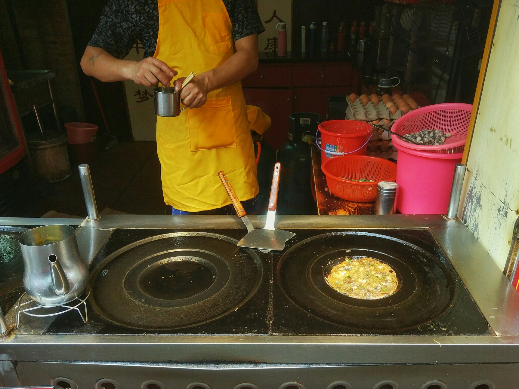 制作海蛎煎的锅也是特制的,最里面一圈先煎海蛎,然后在外圈在煎鸡蛋。