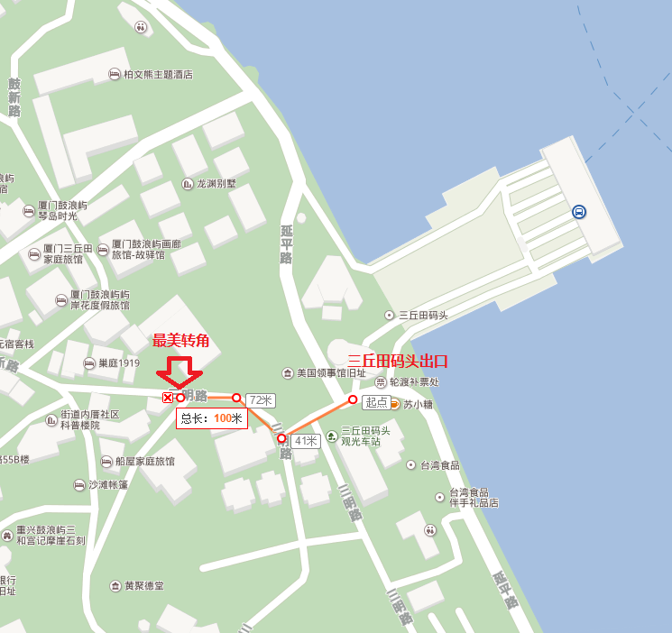 “最美转角”其实十分好找,从三丘田码头下来,步行100米就能到达,具体位置线路见下图。