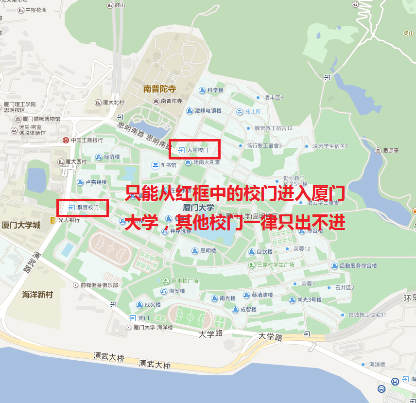 游览厦门大学,必须先了解它的开放时间,为了不影响学生上课,厦门大学对游客进入有严格规定,周一到周五学生上课期间,游客进入学校时间为12:00-14:00(有人数限制)以及17:00-24:00,周末节假日和寒暑假全天开放。学校对游客只开放大南校门和群贤门,去厦大的话注意从此二门进入,以免走冤枉路,其它校门对游客一律只出不进。游客进入厦门大学,需要验证身份证。(注意,大南校门,也叫大南门,并不是厦大的南门,事实上它位于厦大的北边,门朝西面,对着南普陀寺)