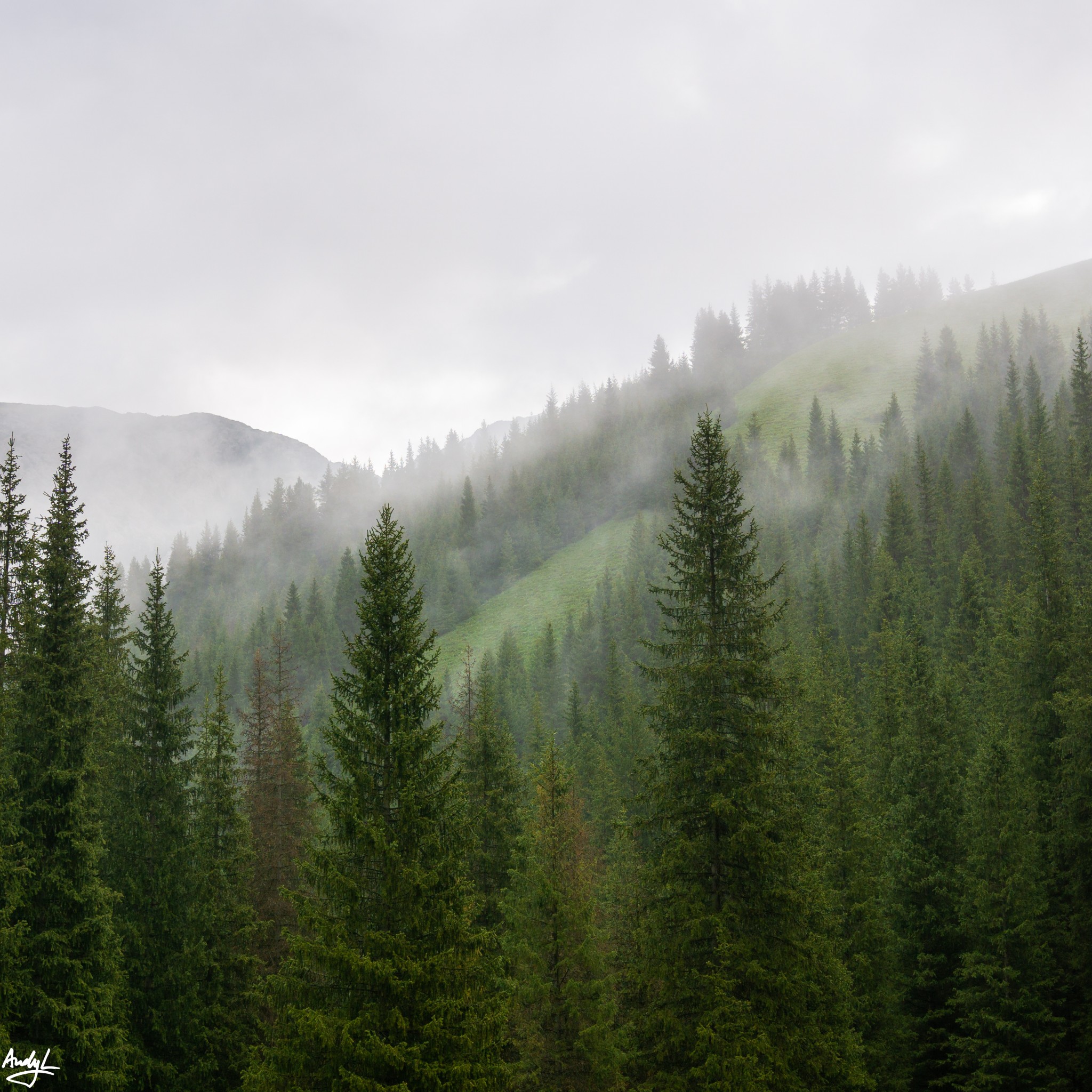 第二天大早,我们早早爬起来,期待能有好天气,但是事与愿违,天气依旧阴沉。早晨的山上还有薄雾。