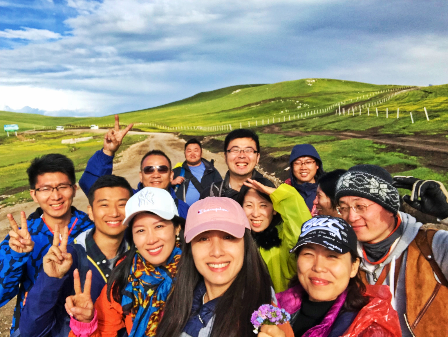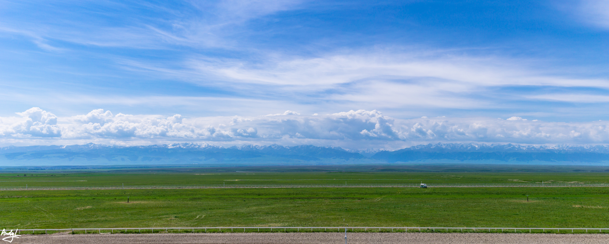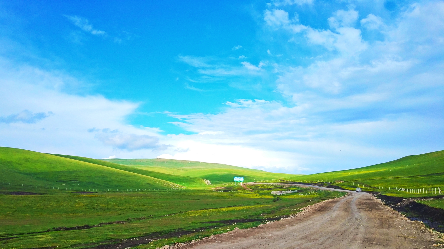 来到大路上之后,天气一下放晴了,碧绿的草原和蓝天一下扫去了之前的阴霾和坏心情。