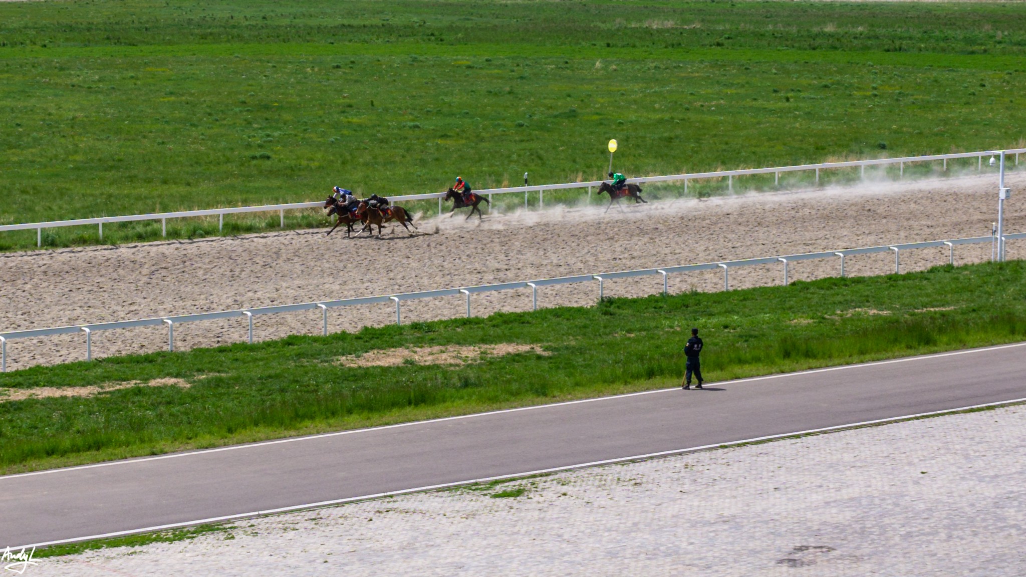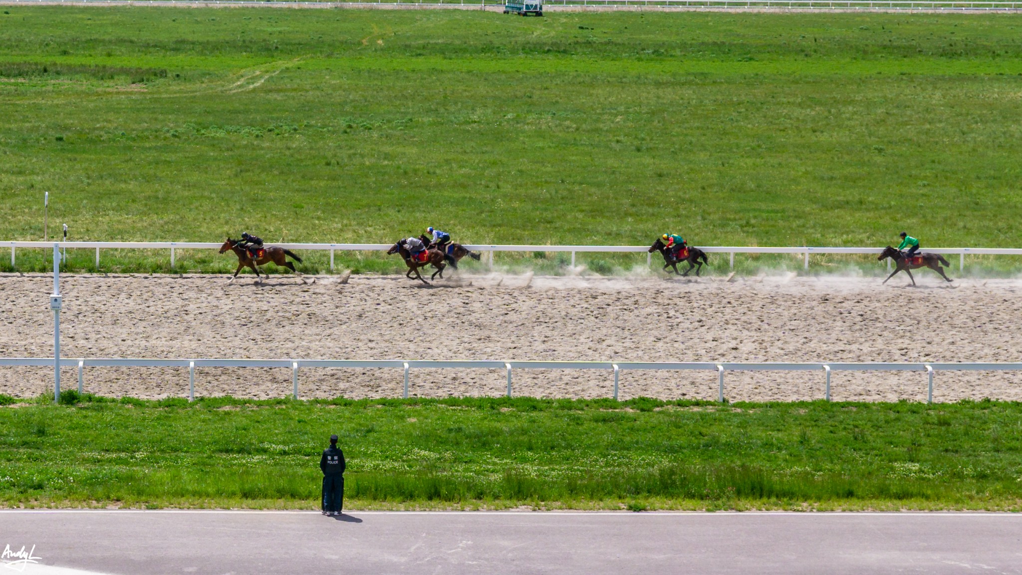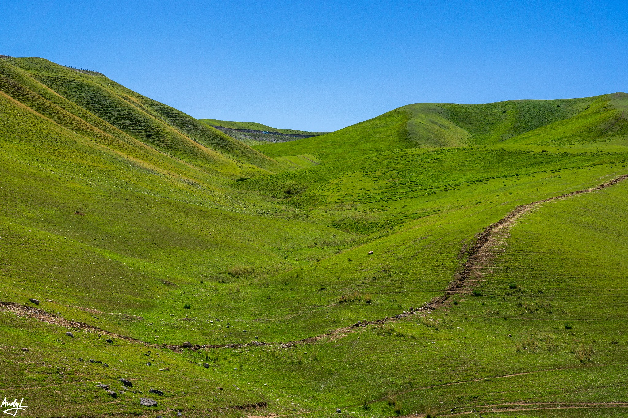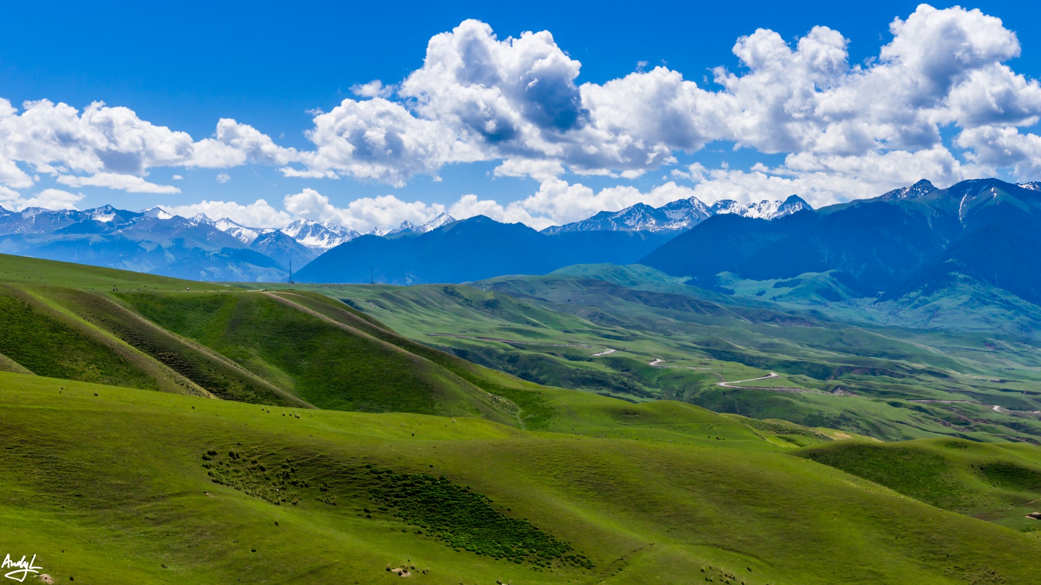 来到大路上之后,天气一下放晴了,碧绿的草原和蓝天一下扫去了之前的阴霾和坏心情。