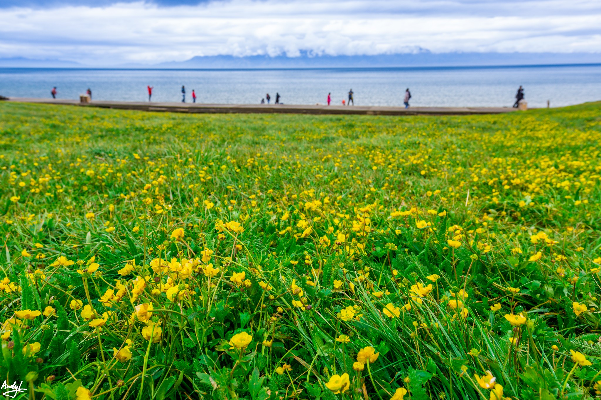 湖边的只是星星点点开着一些小花,还不成气候。低温和寒风让人没法久待。远处有一些拍婚纱照的新人,在寒风中瑟瑟发抖。