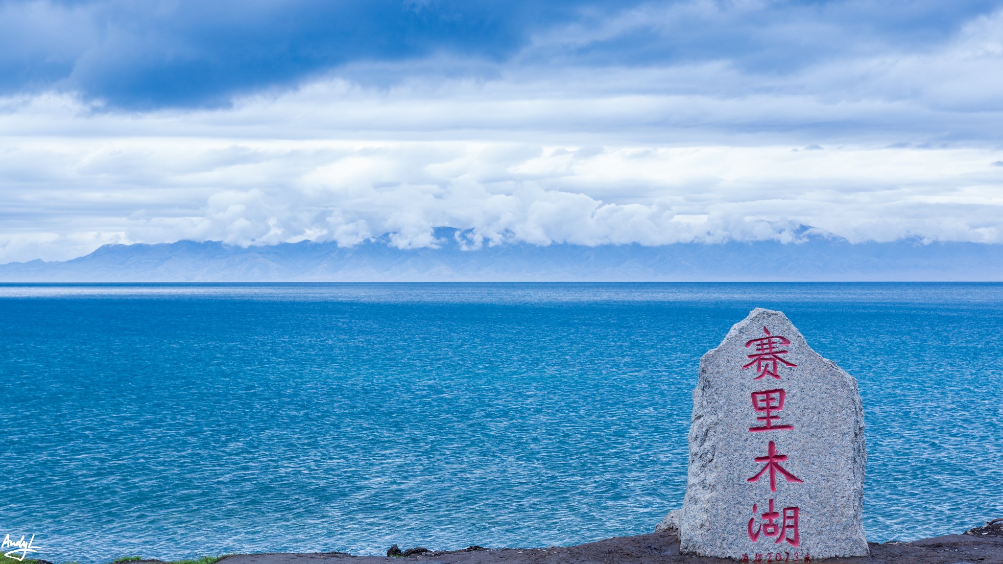 赛里木湖太大,光环湖路就有90公里长,等我们的车开到景区大门的时候,天色已经变了,密布的乌云下,湖水的颜色也发生了改变,总的来说,湖面的颜色基本倒映天空的颜色。