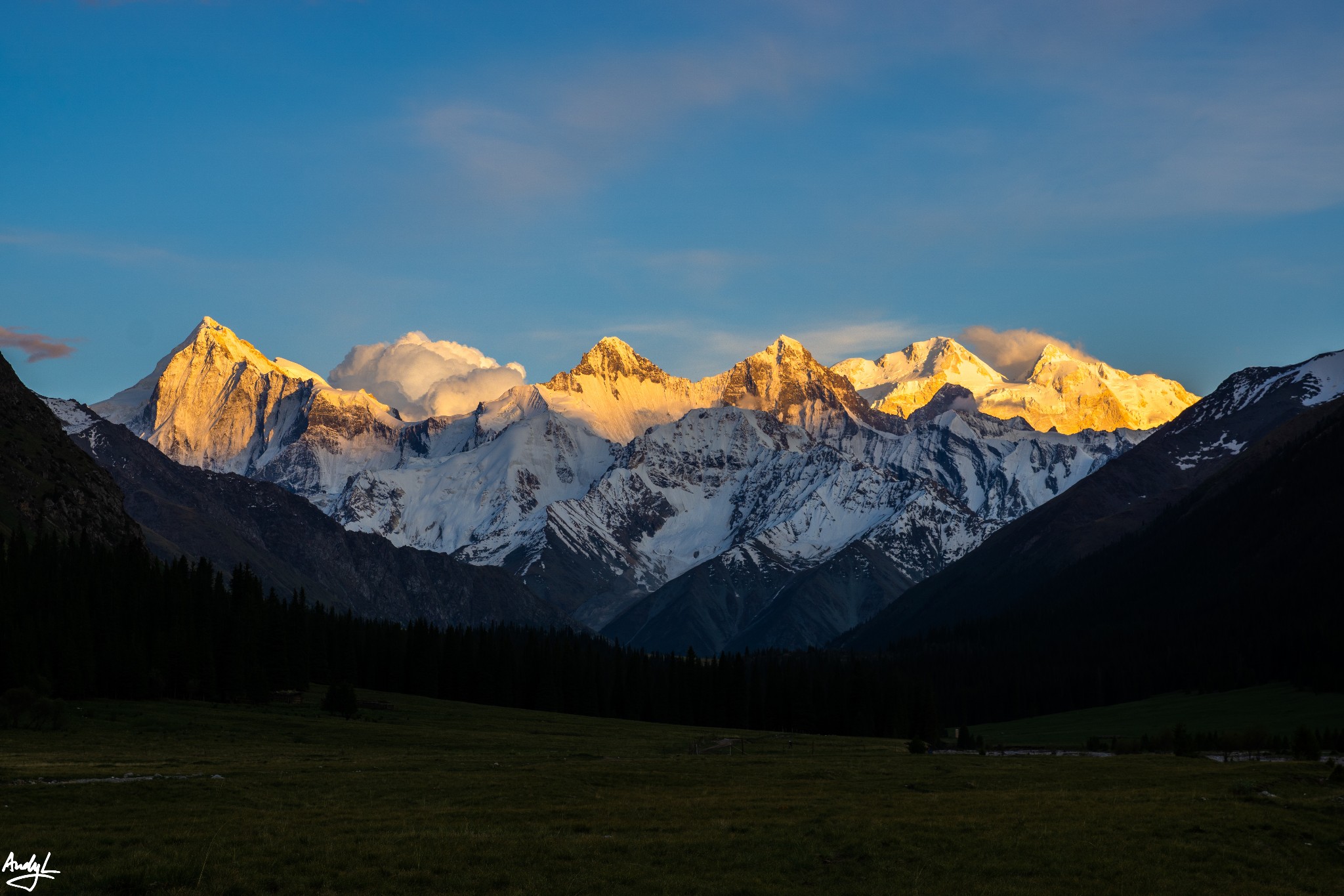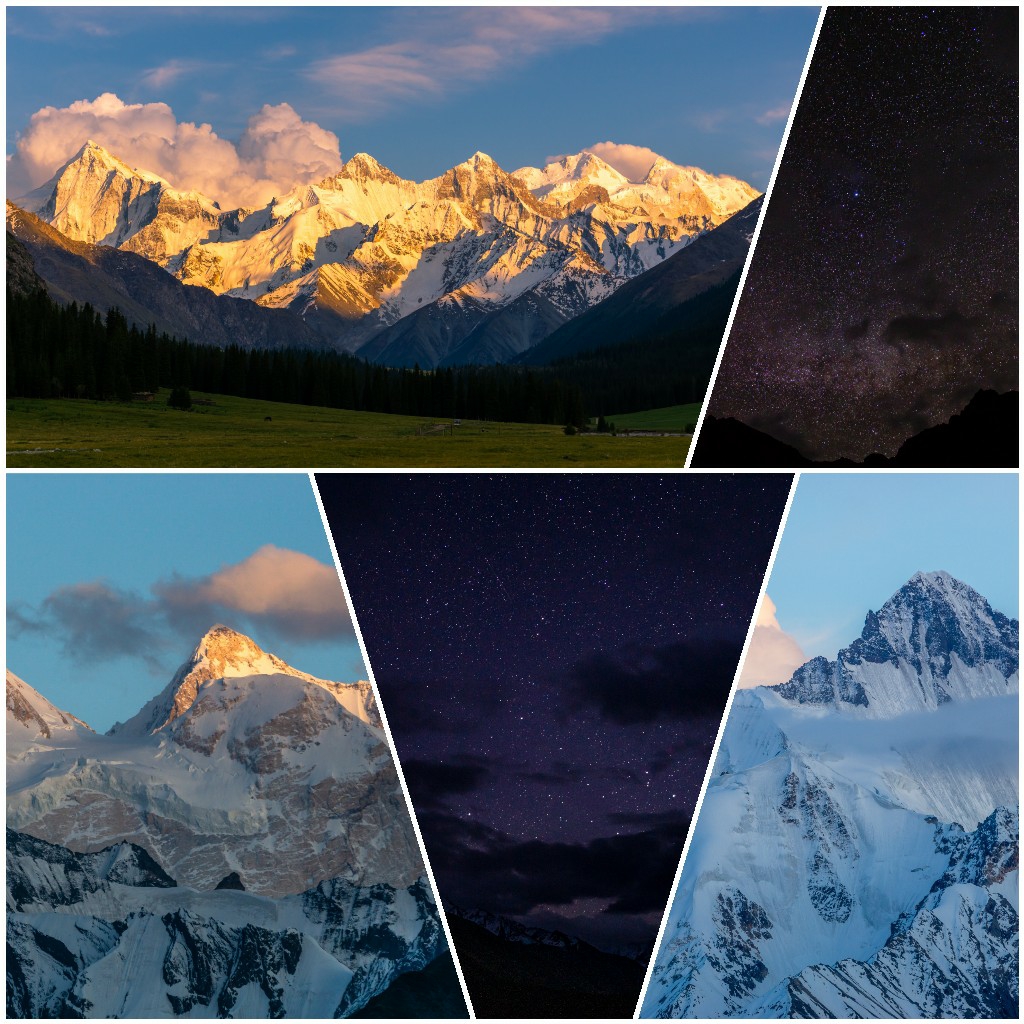 同行的伙伴借了我一个长焦镜头,让我得以拍摄到雪山的近景,天山山脉的第二高峰——汗腾格里峰就隐藏在这雪山群之中。
