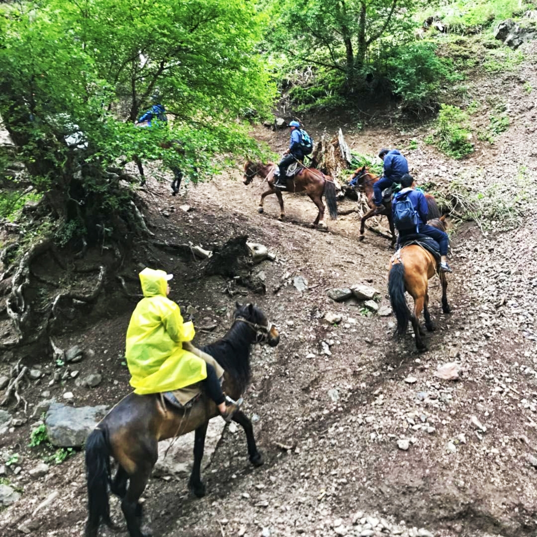 从琼库什台到喀拉峻一共有19公里的路程,骑马一共需要4个小时,途中需要翻越两座山,翻山的过程中马几乎都是贴着山走,边上就是悬崖,有一定危险性,好在每一批马都配有一个马夫。对于平时不骑马的我们来说,骑马的时候不免有些紧张,全程都在想着怎么控制好马匹,路上都没怎么用手机拍照。