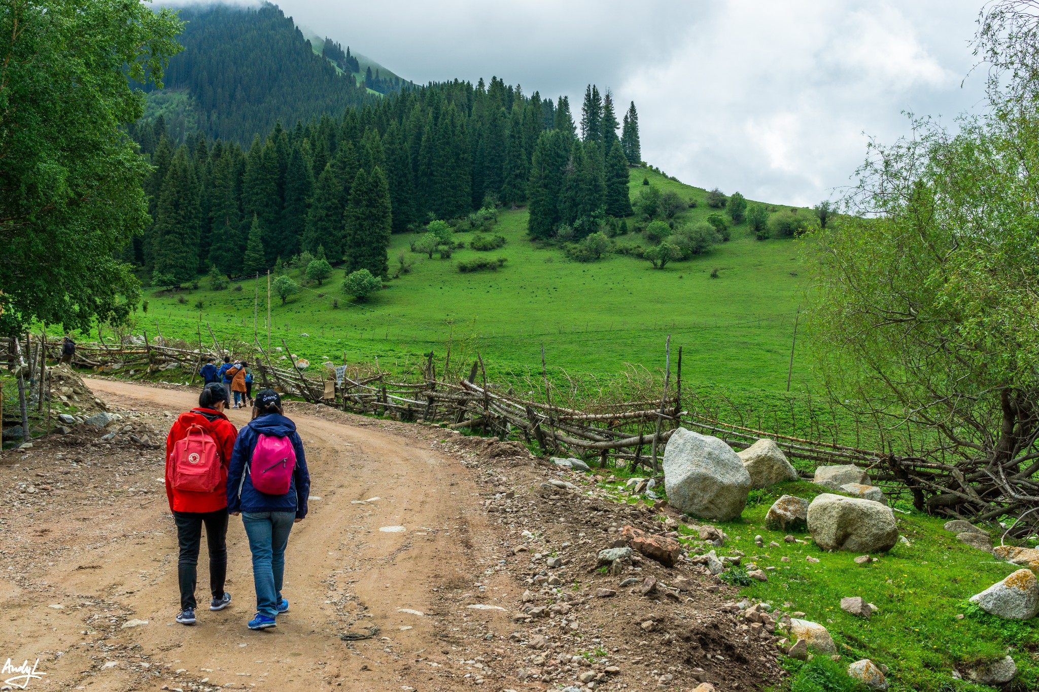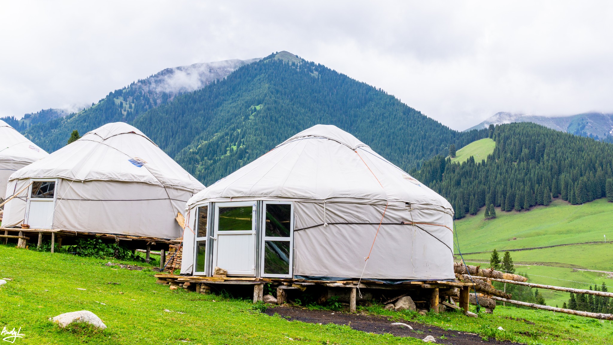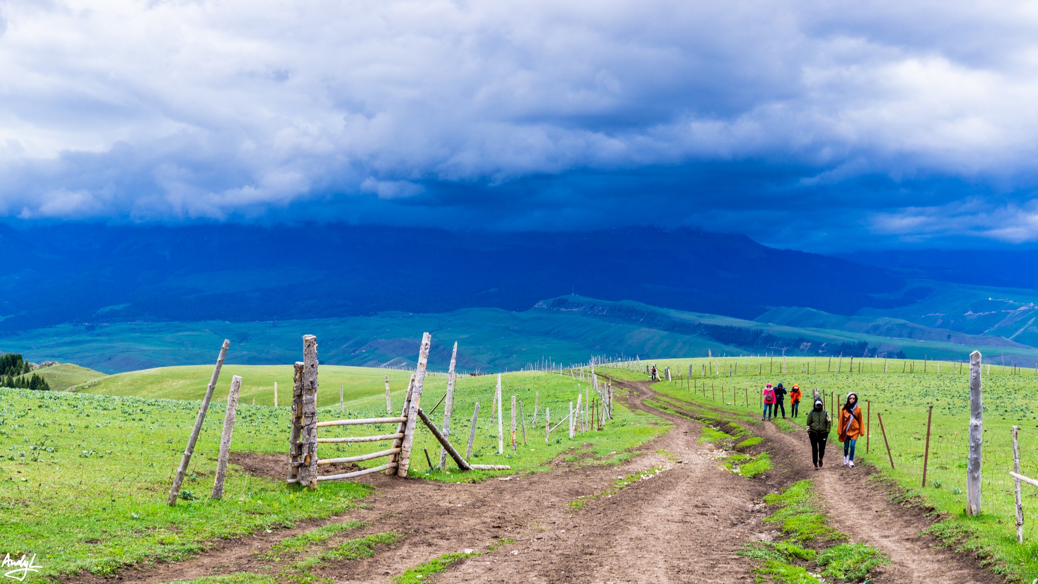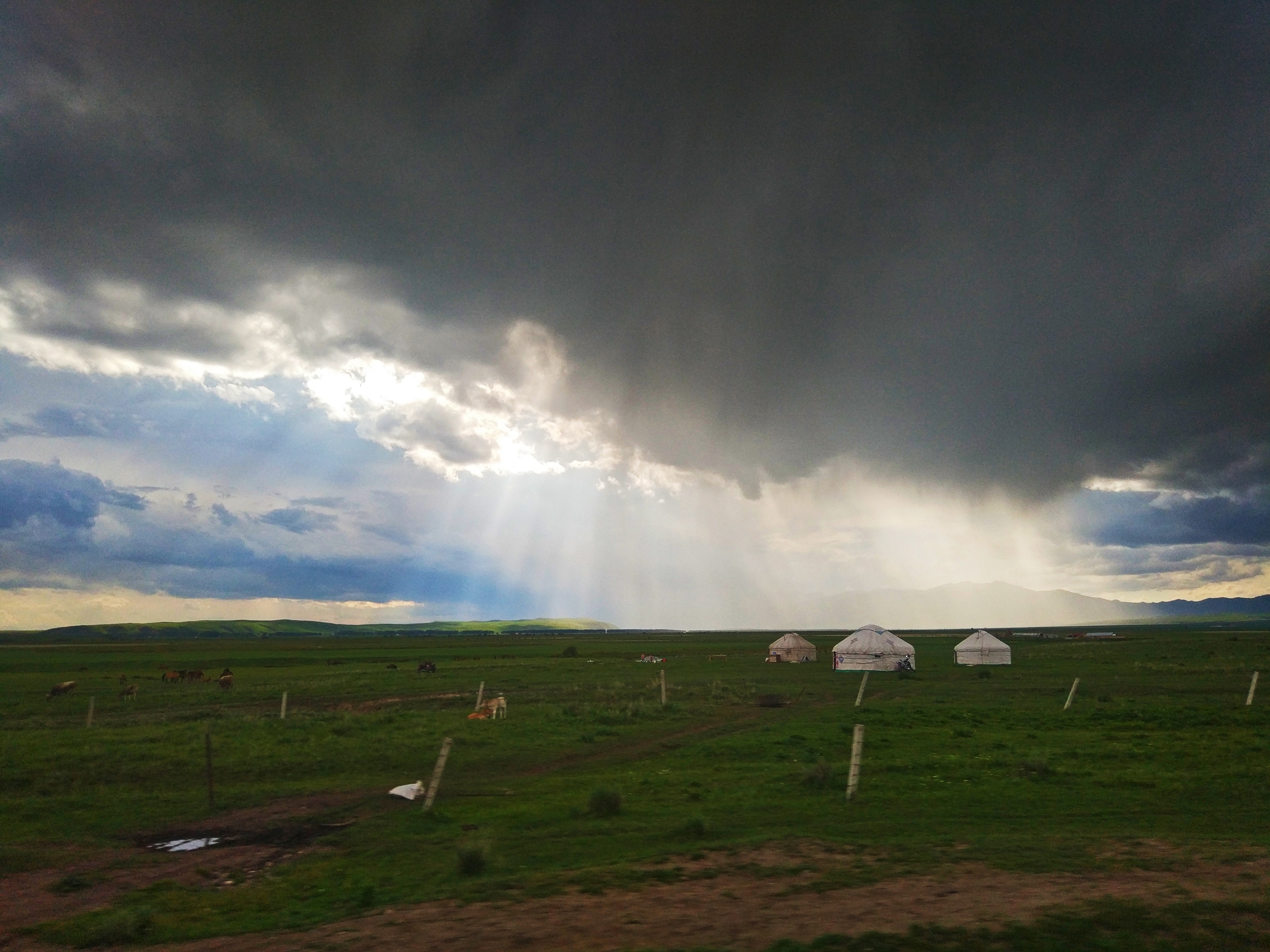 这时发生了一些不愉快的小插曲,马队的人见大雨将至,早早将我们抛下,带着马儿下山去了。而我们距离乘坐喀拉峻景区车的地方还有好几公里路程,无奈的我们只能暂时躲进一个蒙古包内,联系景区工作人员,得知还有车之后,只能硬着头皮朝大路走。