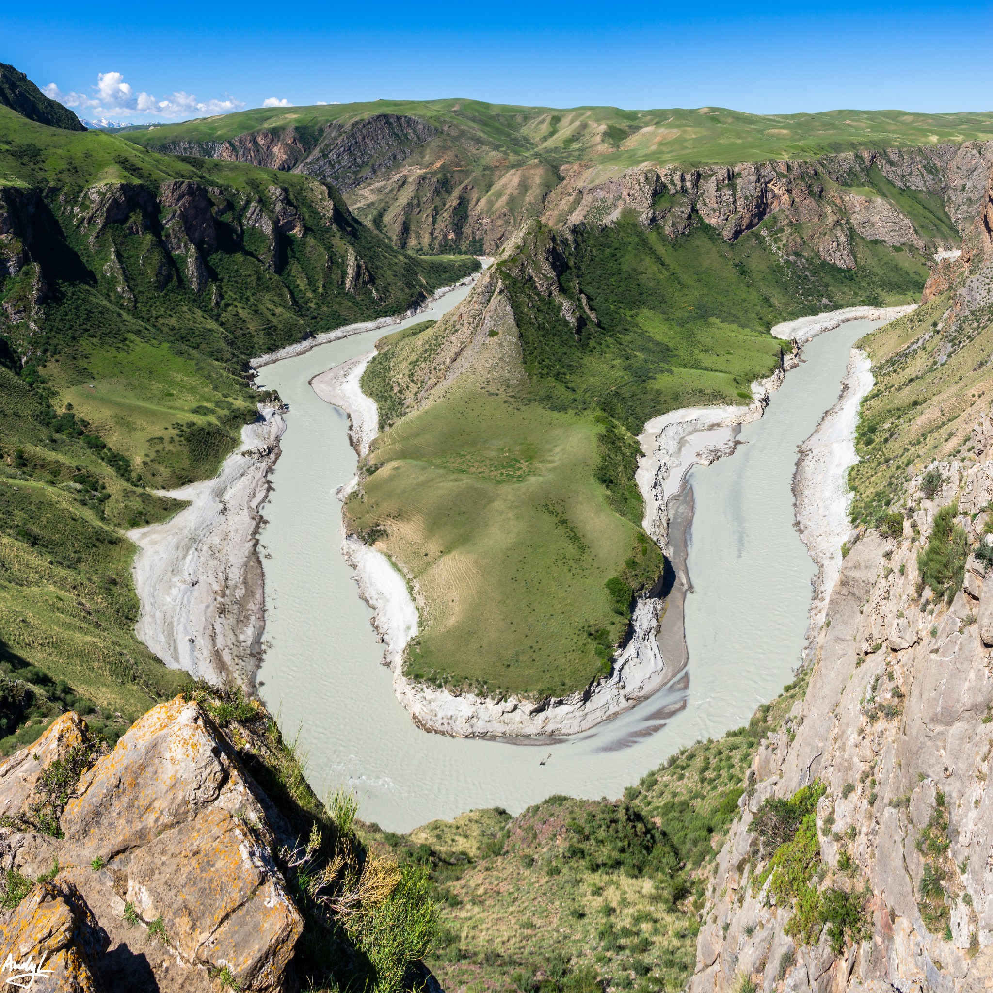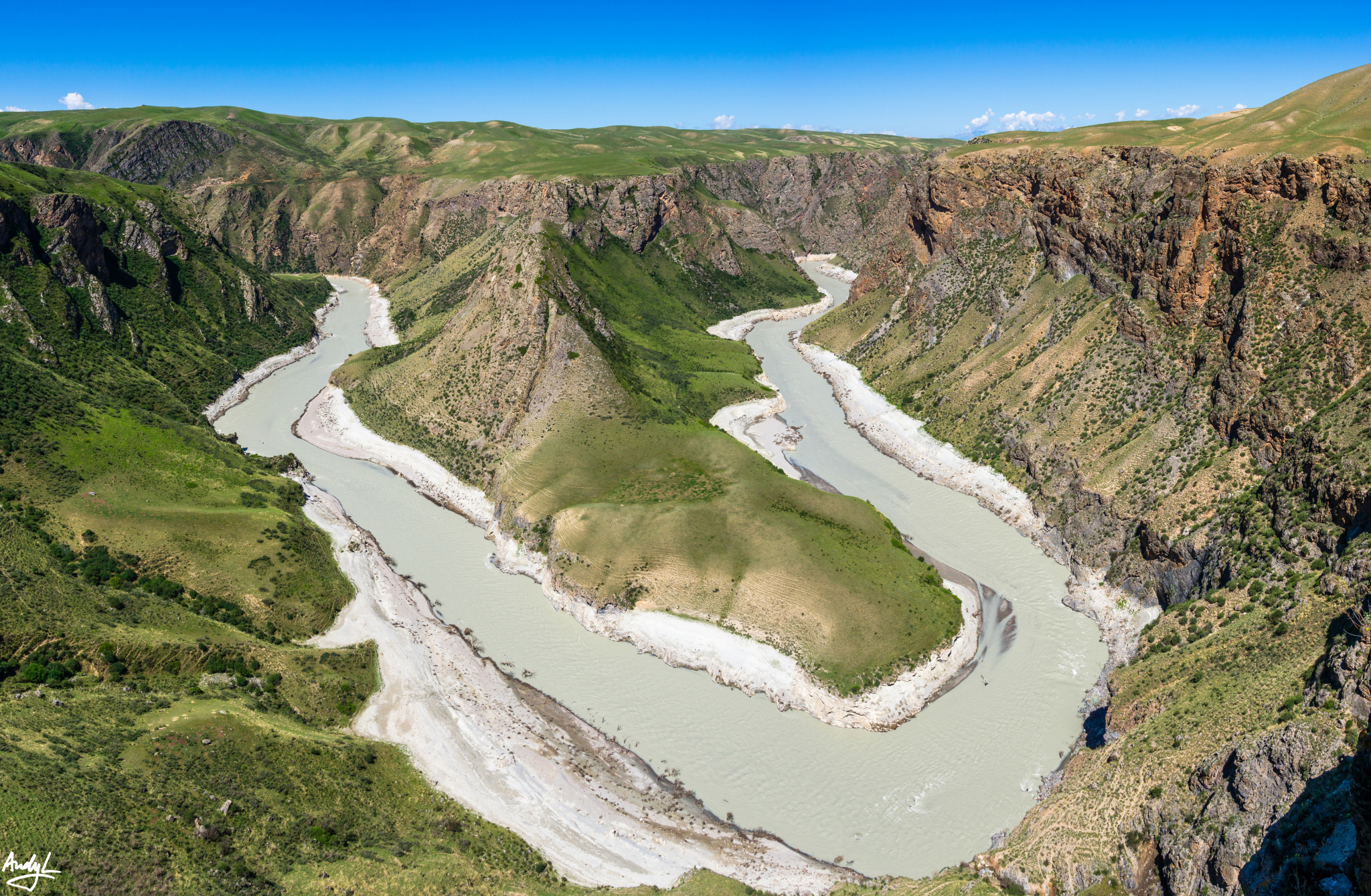 鳄鱼湾是景区车的第一站,阔克苏河在此转了一个180度的大弯,形成的一个半岛好似鳄鱼的头,因此这里得名鳄鱼湾。由于阔克苏河水富含大量矿物质,因此在晴朗的天气下,河水呈乳白色。
