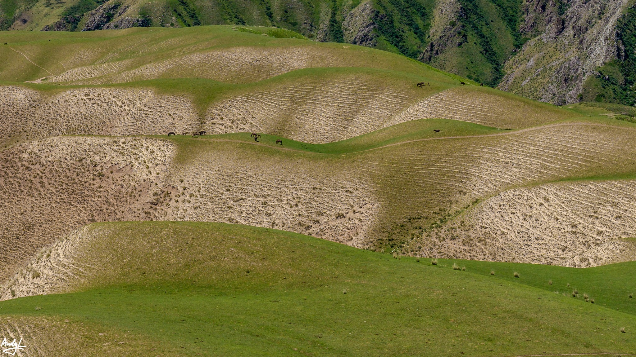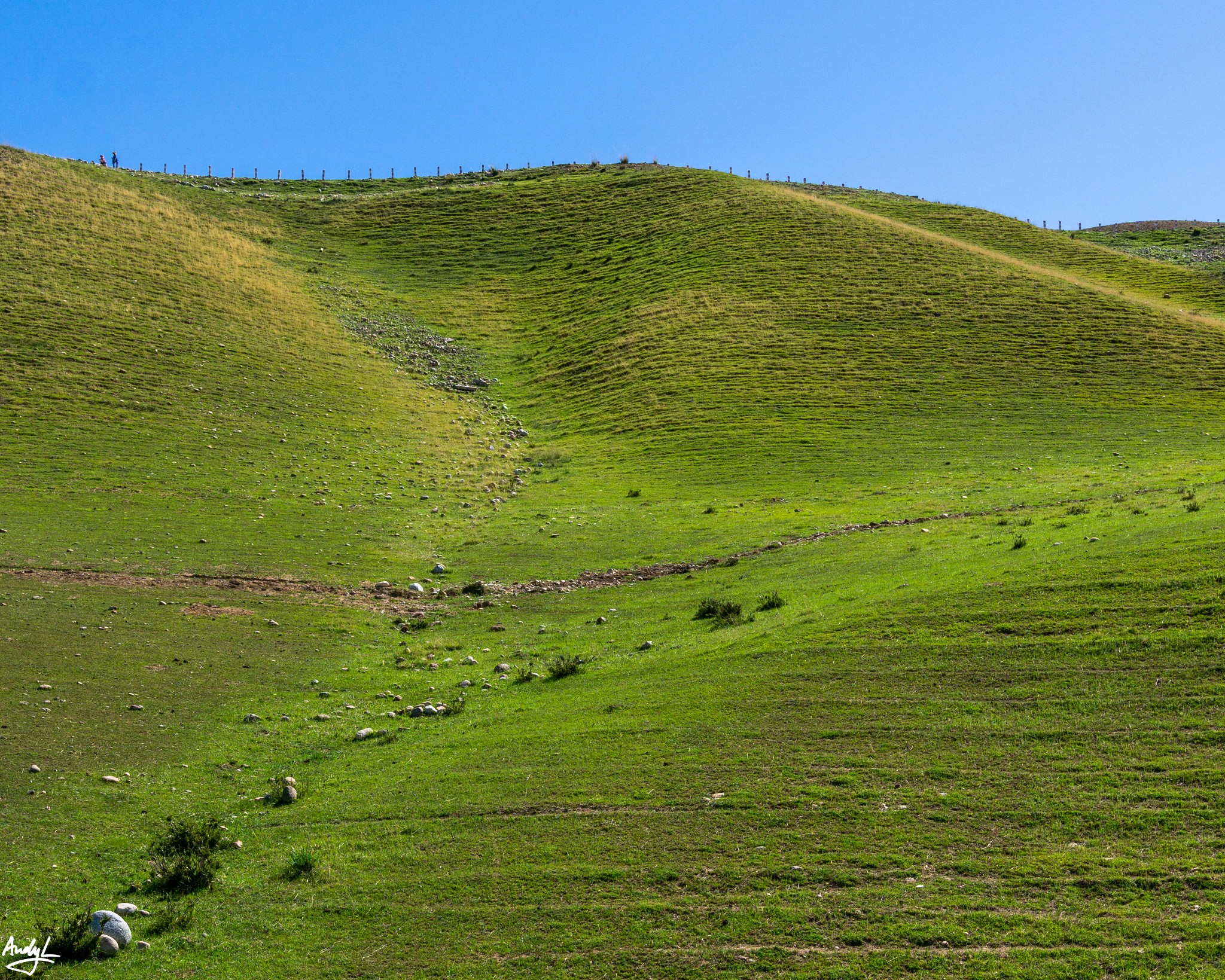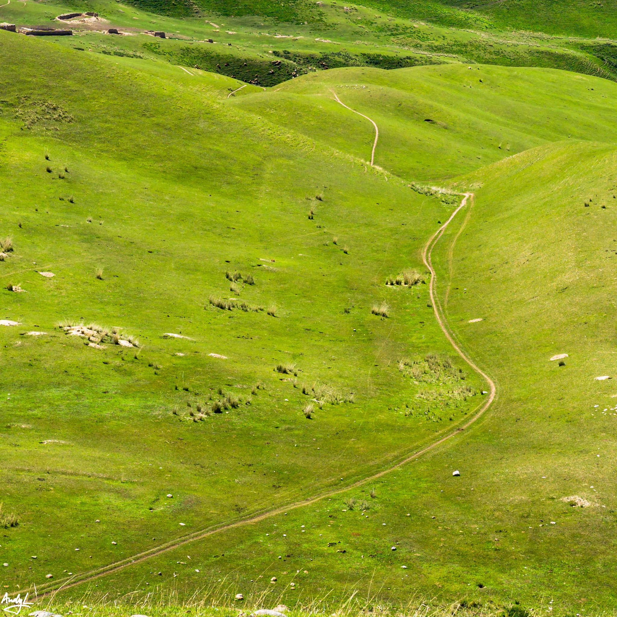 喀拉峻著名的人体草原就在阔克苏大峡谷,只不过我们去的时候是正午时分,光线不好,如果需要拍摄人体草原,最好的时间是在傍晚(当地时间20:30左右),而且,一定要带长焦镜头。我们到的时候人体草原的草似乎长得还不够密,估计要再晚来一个月效果才最好。