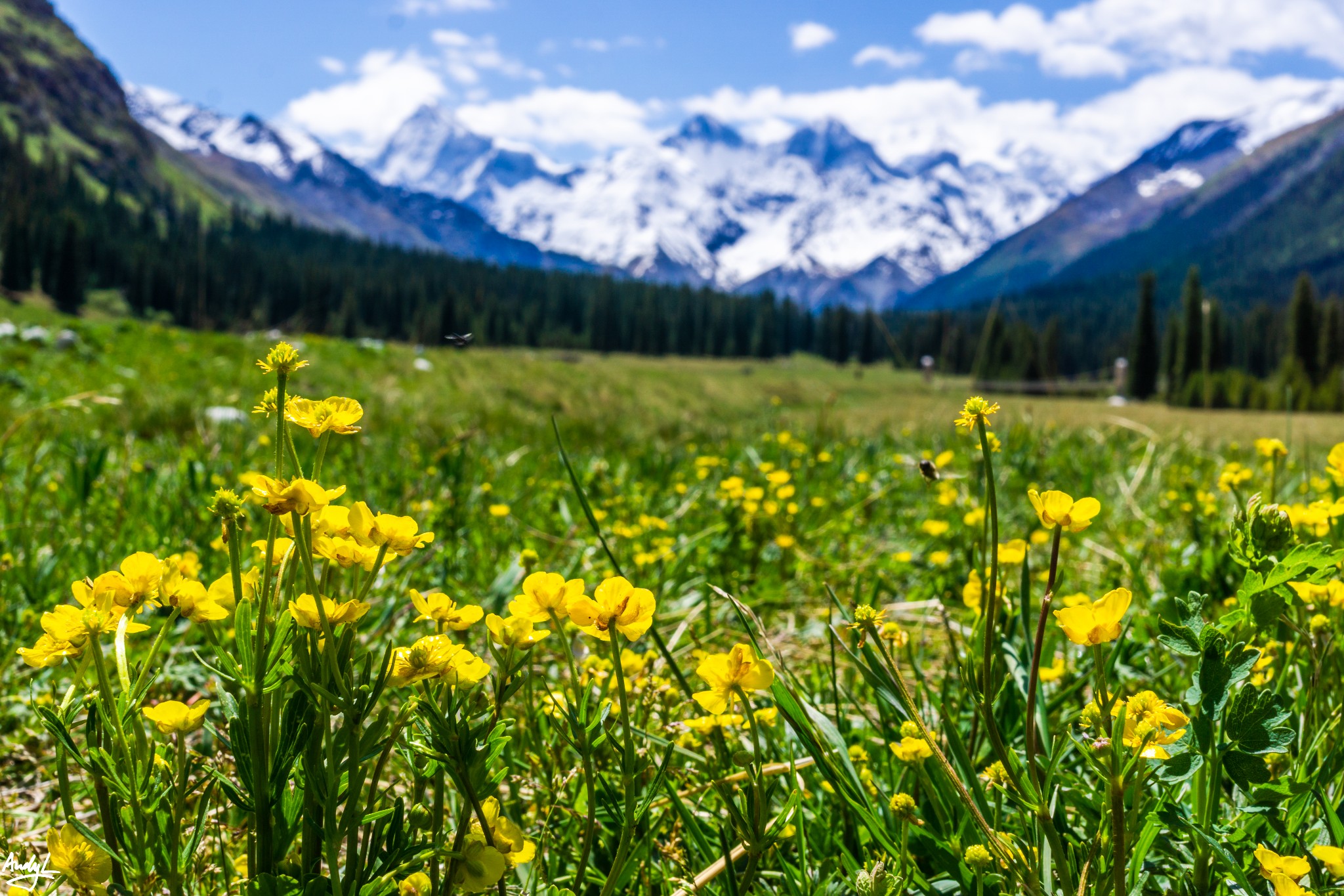 与我们此行的其他地方一样,夏塔河谷的鲜花也还未盛开,只有路边星星点点的小黄花衬托着远处的雪山。