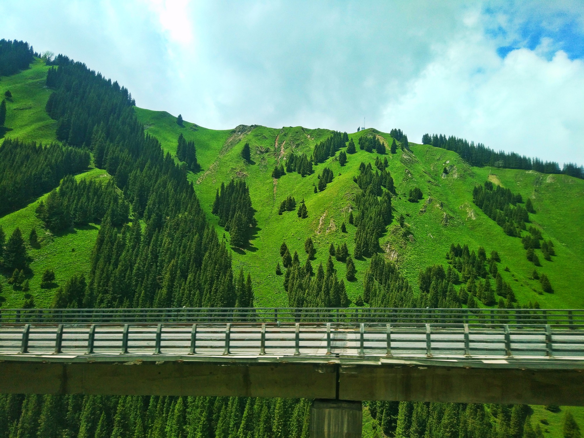在去赛里木湖的路上,其实我们已经经过了果子沟,只是当时没有停车,只在车上透过车窗拍了几张照片(事后证明当时应该趁天气好停车多拍几张)