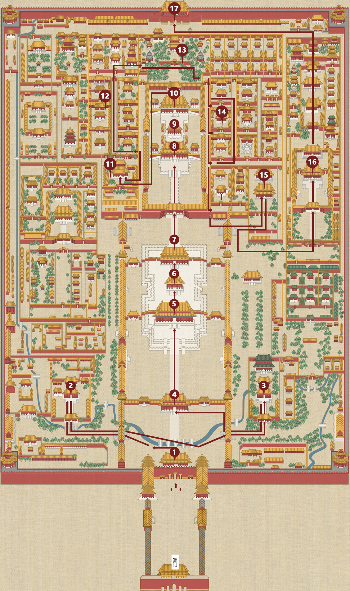 2小时路线:这是最快的游览故宫的路线,这条线,基本只包含故宫的中轴线,可以让人领略故宫最雄伟的建筑,这是大多数旅行团的常规路线。