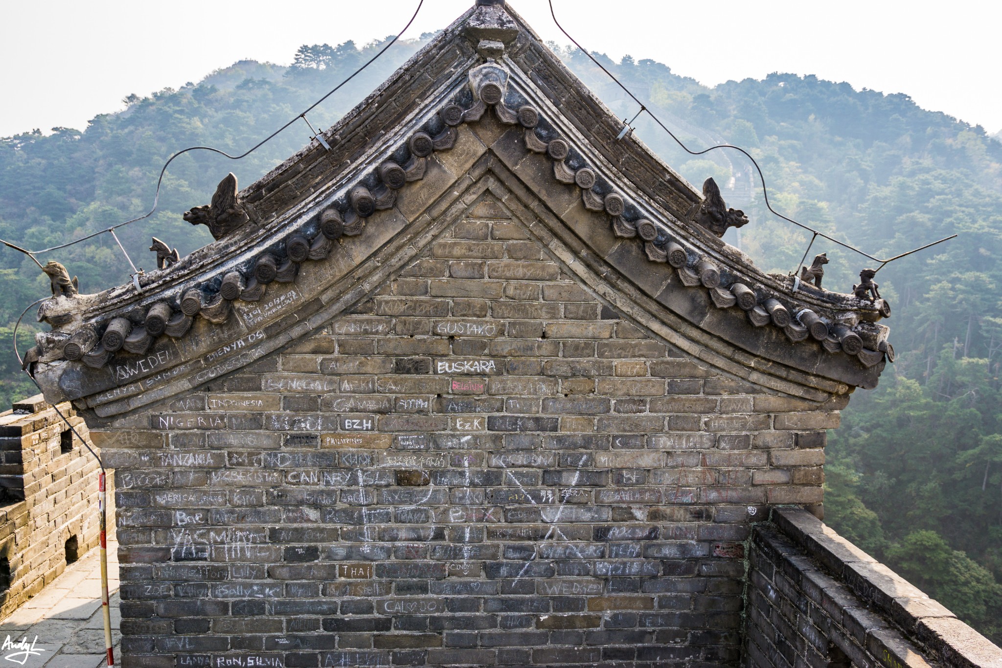 作为游客,我们应该为能看到这样的完整的历史遗迹而庆幸,但是长城上仍然可以看到很多涂鸦,原本以为只有国人才会这样,然而,慕田峪长城的涂鸦绝大多数是外国人涂写。没想到老外也有“到此一游”的癖好。