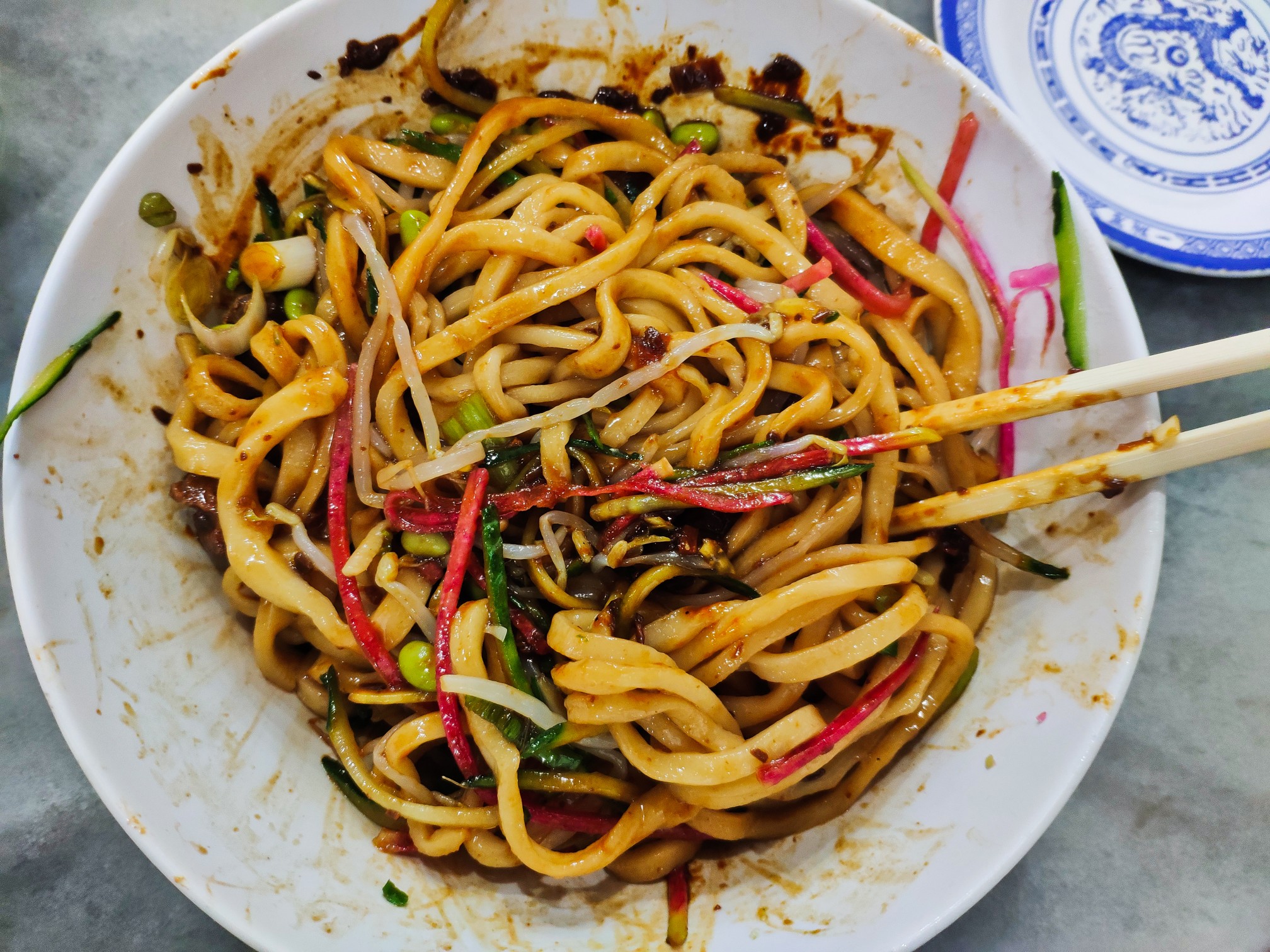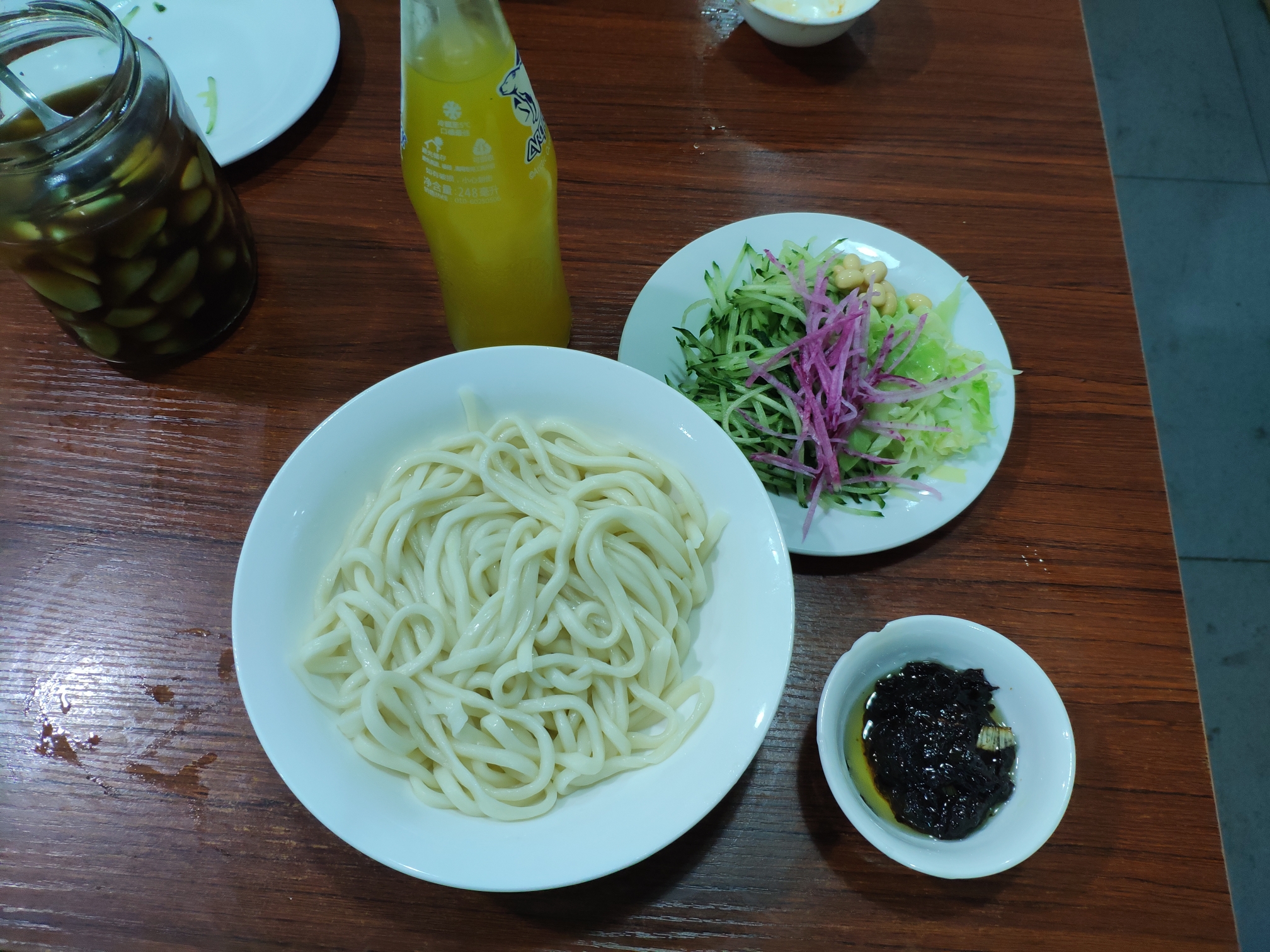 吃的时候把酱倒入面碗里拌匀,卖相瞬间打了折扣,但是只要好吃就行。之前听人说炸酱面很咸之类云云,我个人感觉还好,也许是这些年口味变重了吧。整碗面荤素搭配,而且也是我爱的拌面类型。只不过,个人觉得还是没有重庆的豌杂面好吃。
