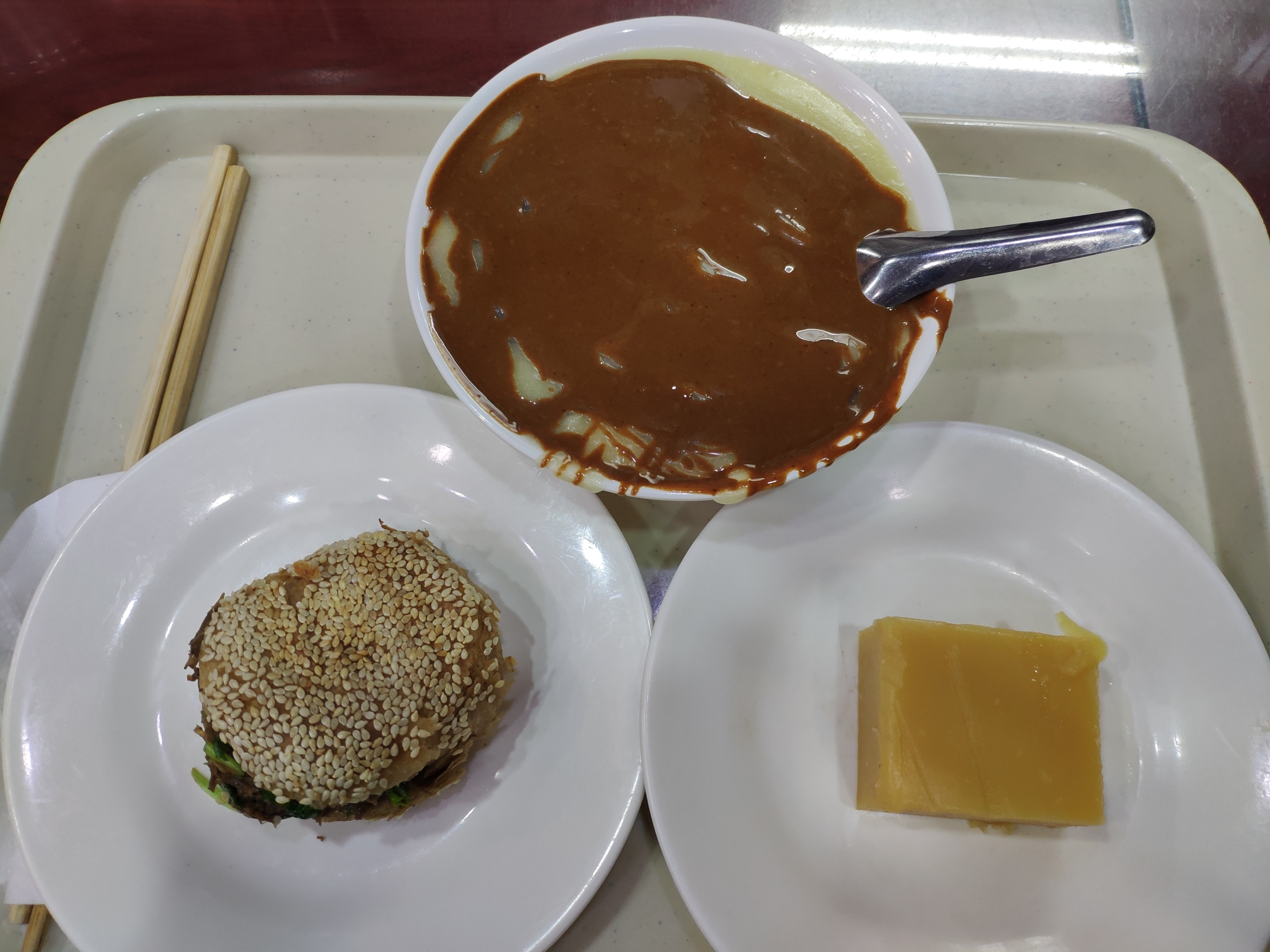 北京的小吃种类很多,护国寺小吃店应该是种类比较全的了,且在全市有多家分店,价格也比较厚道。因为已经吃过炸酱面,所以没有点太多。只吃了面茶、烧饼夹牛肉和豌豆黄。本来想尝试一下豆汁,后来再三犹豫还是放弃了。。