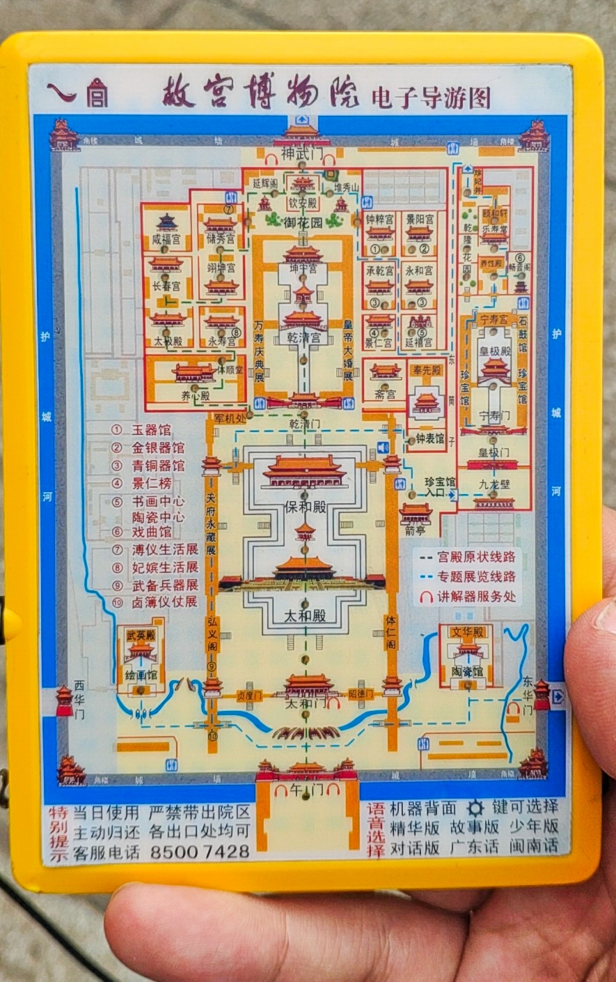 若是散客前往,无论选择哪一条线路游玩,强烈建议租用一个电子讲解器,中文版的20元一个。故宫的每个宫殿都有各自典故,若没有讲解,则很难得到完整的参观体验。讲解器打开后可以根据所在的位置自动讲解,讲解分为精华版、故事版、少儿版、对话版、闽南话版、粤语版等6种版本,适合不同类型的人收听,每个版本的内容会稍稍有些区别了,如果时间充裕的话,可以多听几个版本。