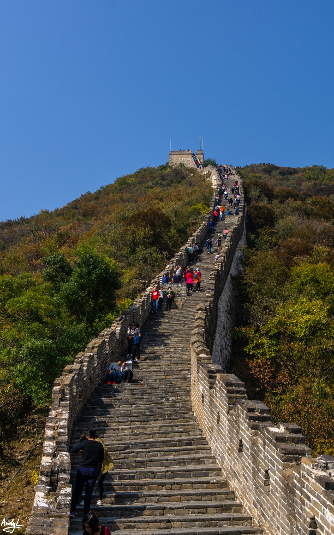 照片也许拍不出这段长城的陡峭,但是目测坡度应该不会小于45度,再加上两座敌楼之间相隔距离较长,所以很少有人能一口气爬上去,台阶上随处可见坐着喘气休息的游客。