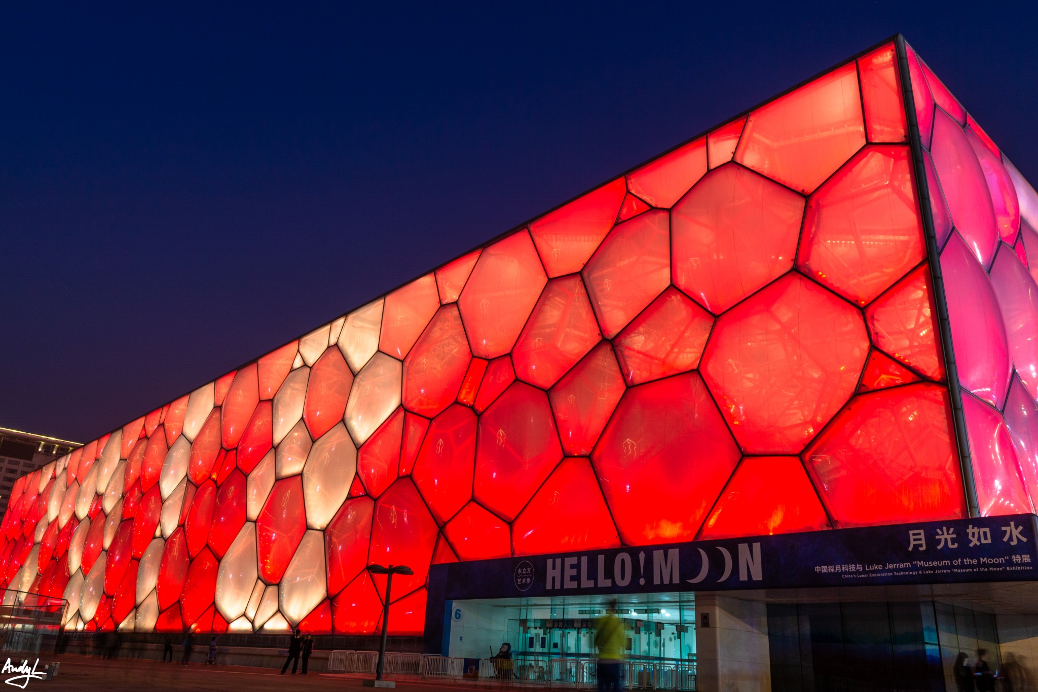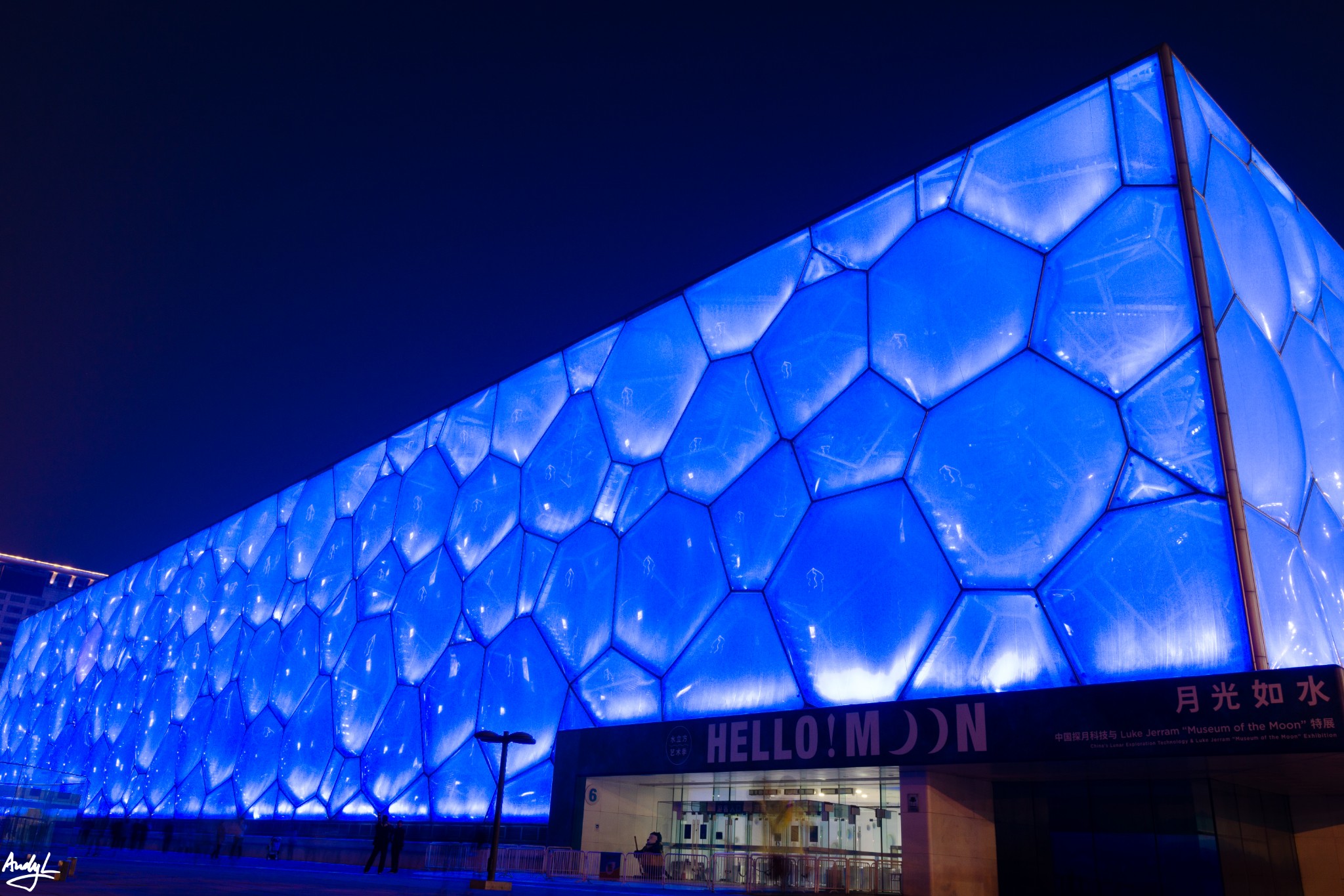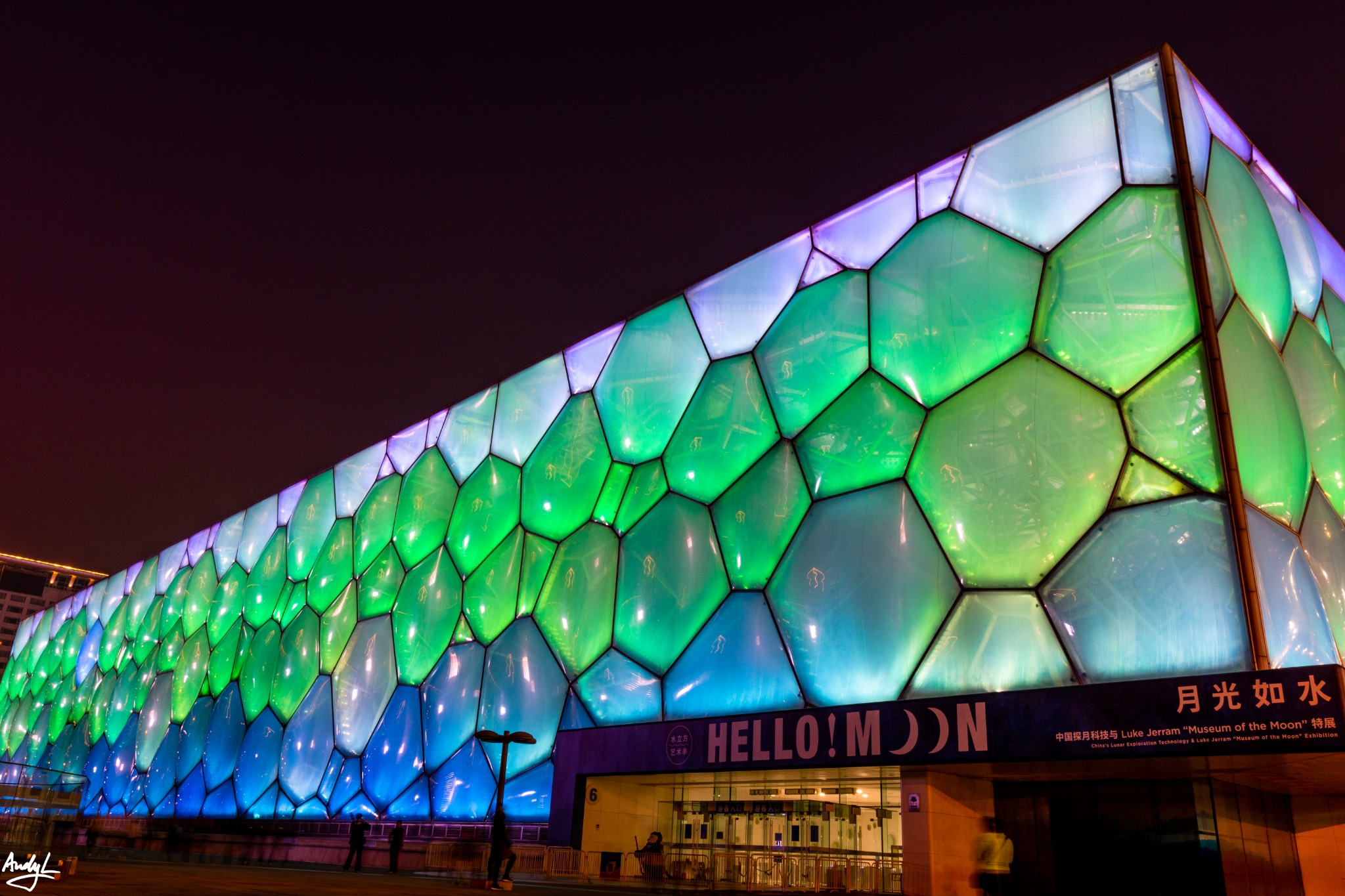 与鸟巢的传统色灯光不同,水立方不断地变化着颜色,现代而动感