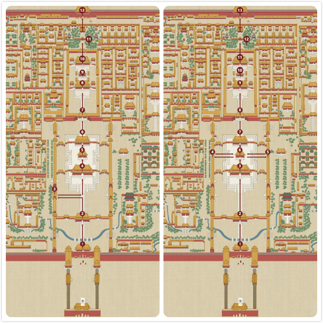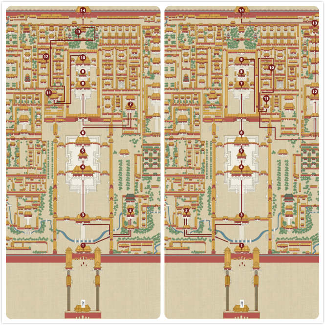 半天路线:这条路线除了中轴线之外,还会在外朝东西路、东西六宫、珍宝馆/钟表馆中各选其一游览,与两小时路线相比,这条线路可以让人对故宫中的后宫建筑有所了解。