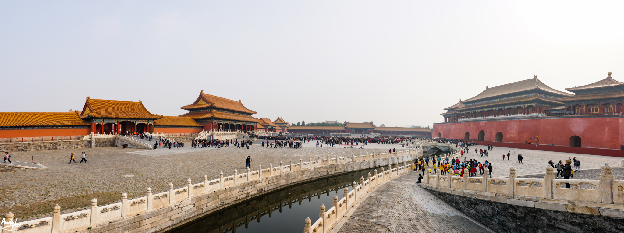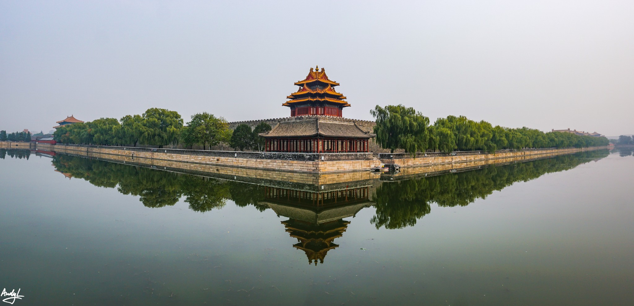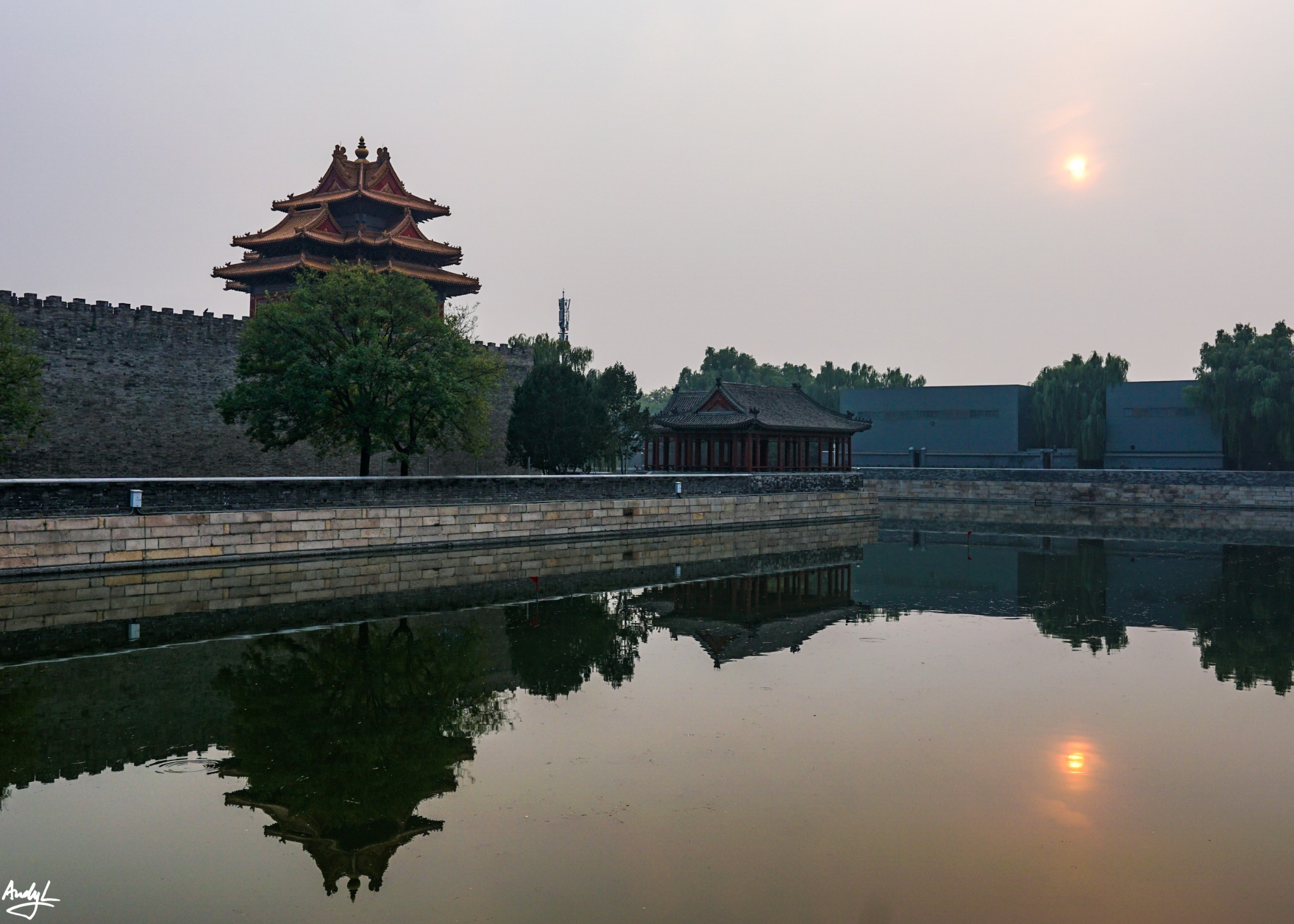 护城河水十分平静,如同镜子一般,美中不足的只是当天的空气质量实在太差。