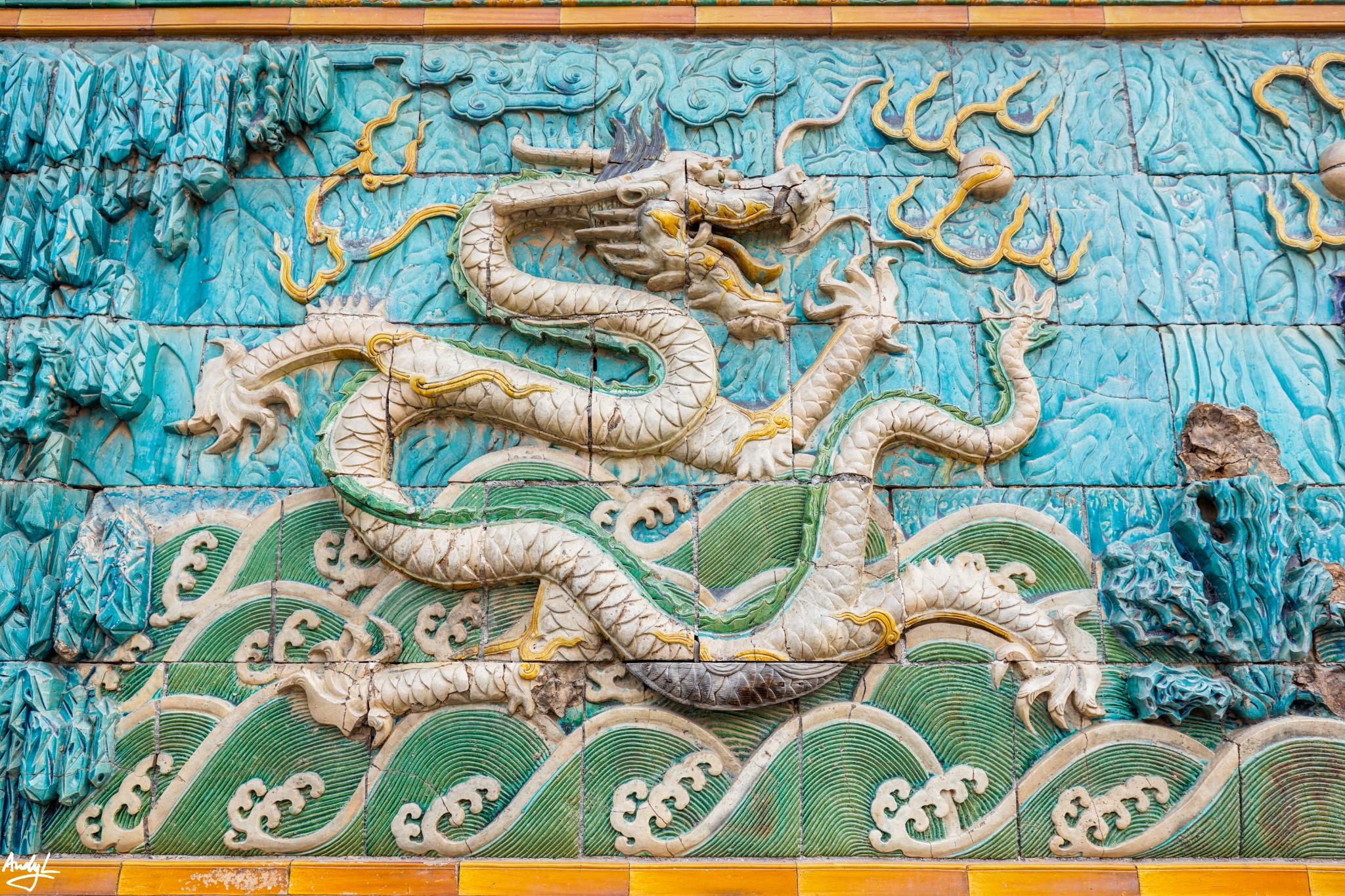 九龙壁中有一个小瑕疵,就在其中一条白龙的腹部,也许是烧制是损坏了一块琉璃瓦,当时工人用一块木头雕成了龙腹的形状,以假乱真,经历百年之后,原来釉彩的颜色退去,木头的本色漏了出来。