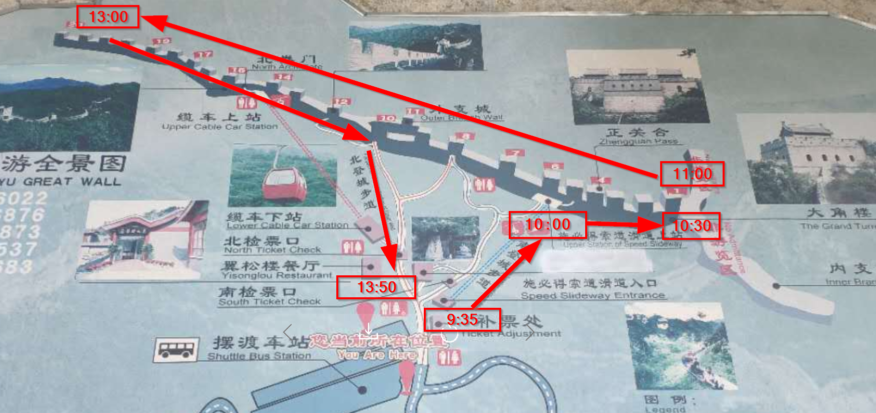 在没有去长城之前,我对爬长城需要花费的体力没有概念,事后,我觉得还是低估了。首先,徒步上山就花去不少体力。如果要徒步游遍所有的敌楼,就几乎要将所有敌楼走一个来回。下图红色箭头是我这次走的路线。具体时间花费如下