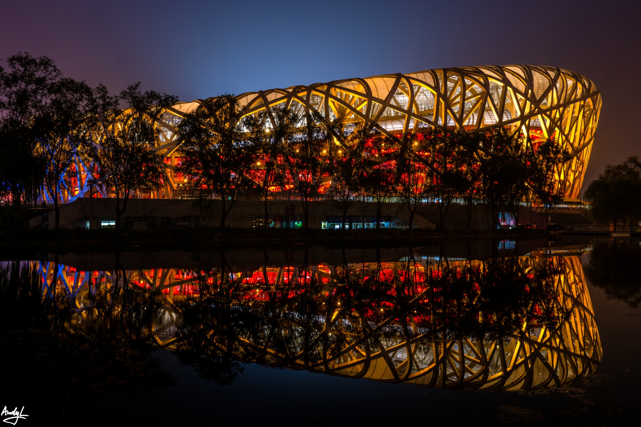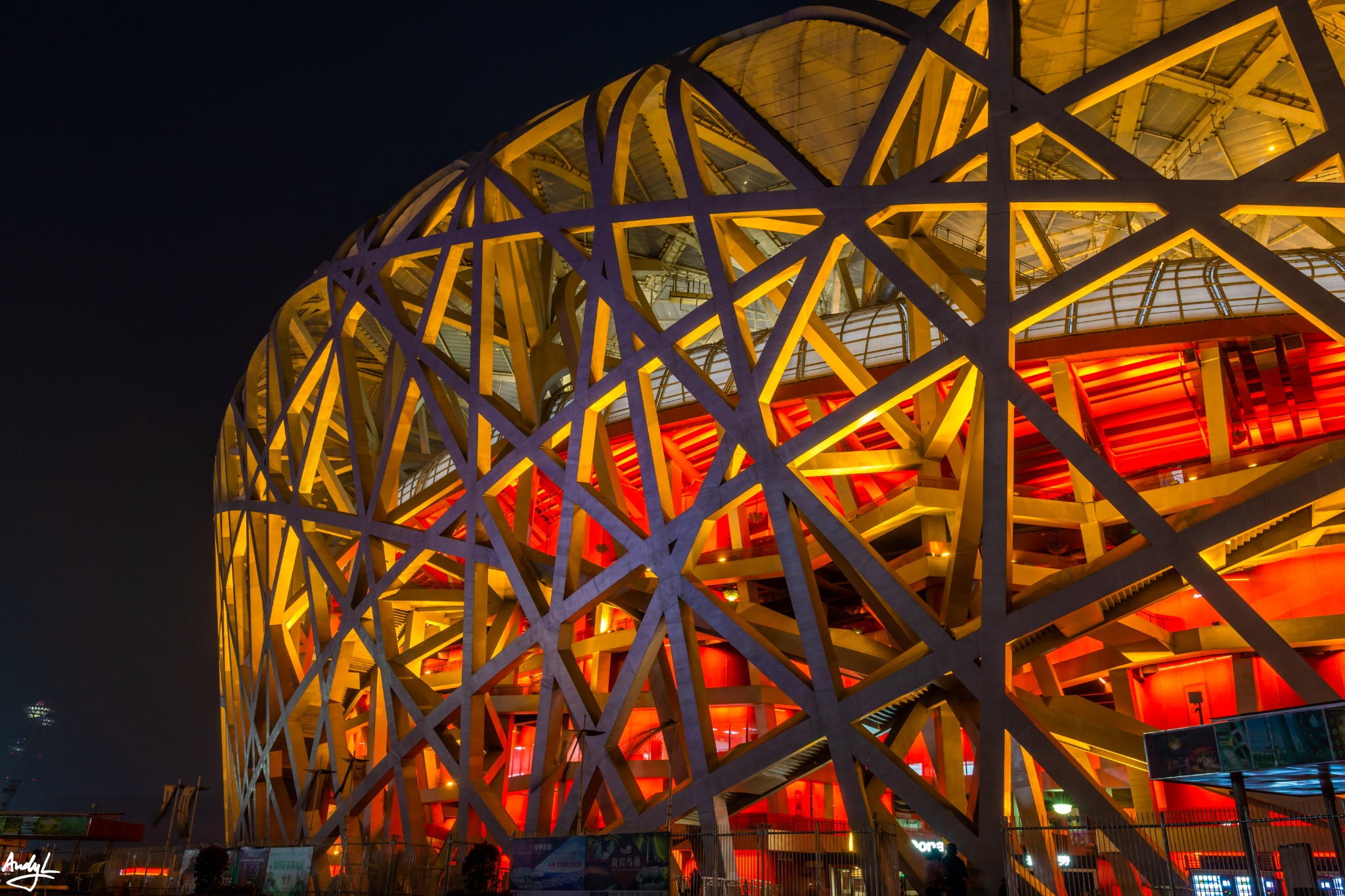 整个奥体公园内挤满了游客,几乎拍不到没有人的照片,但我知道,这里白天的景色并不是最好看的,于是,找了一家肯德基,坐下来休息、补充能量(之前的长城爬得我筋疲力尽)。夜幕降临,整个奥体中心在亮灯之后,完全是另外一幅景象。鸟巢在红色和黄色的灯光点缀下,添加了中国特有的吉祥喜庆气氛。