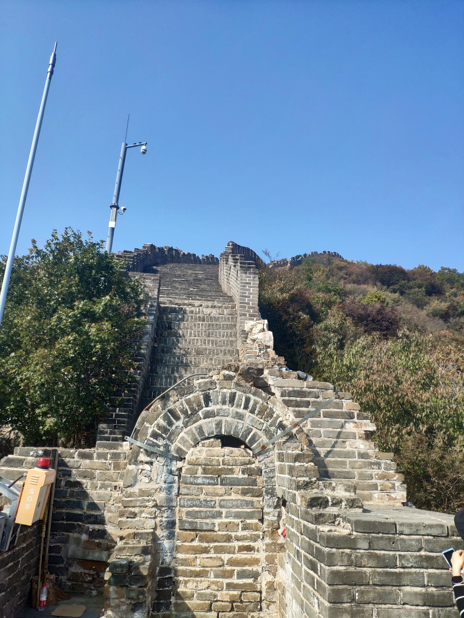 买完票来到景区门口的山下已经9点半了,一车人里面只有我一个是徒步上山的。慕田峪长城开放的城墙,一共有23个敌楼,从低到高,按1到23的顺序编排,登城步道分为南北两段,南段可通往地势较低的6号和8号敌楼,北段则通往地势稍高的10号敌楼,由于我想按敌楼编号从低到高的顺序游览,选择的是从南登城步道上山。之前在车里,随车导游说从山脚下到长城单程需要走1个小时,当时还有些担心,所以路上走得也比较快,不过中途也休息了两三次,到达6号敌楼的时候,也只花了25分钟。我觉得,正常体力的年轻人,从南登城步道到6号敌楼,最多也就30~40分钟的样子。