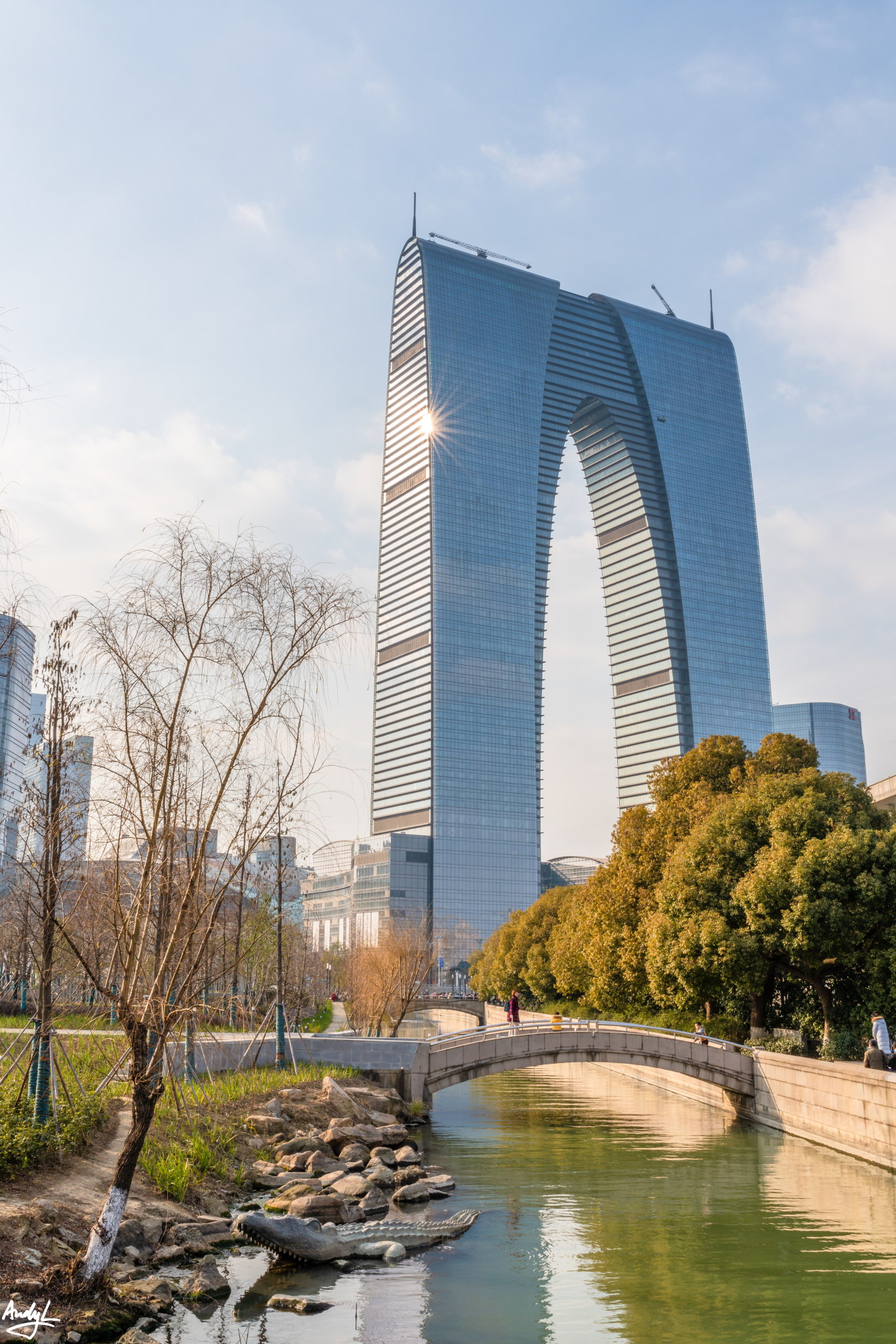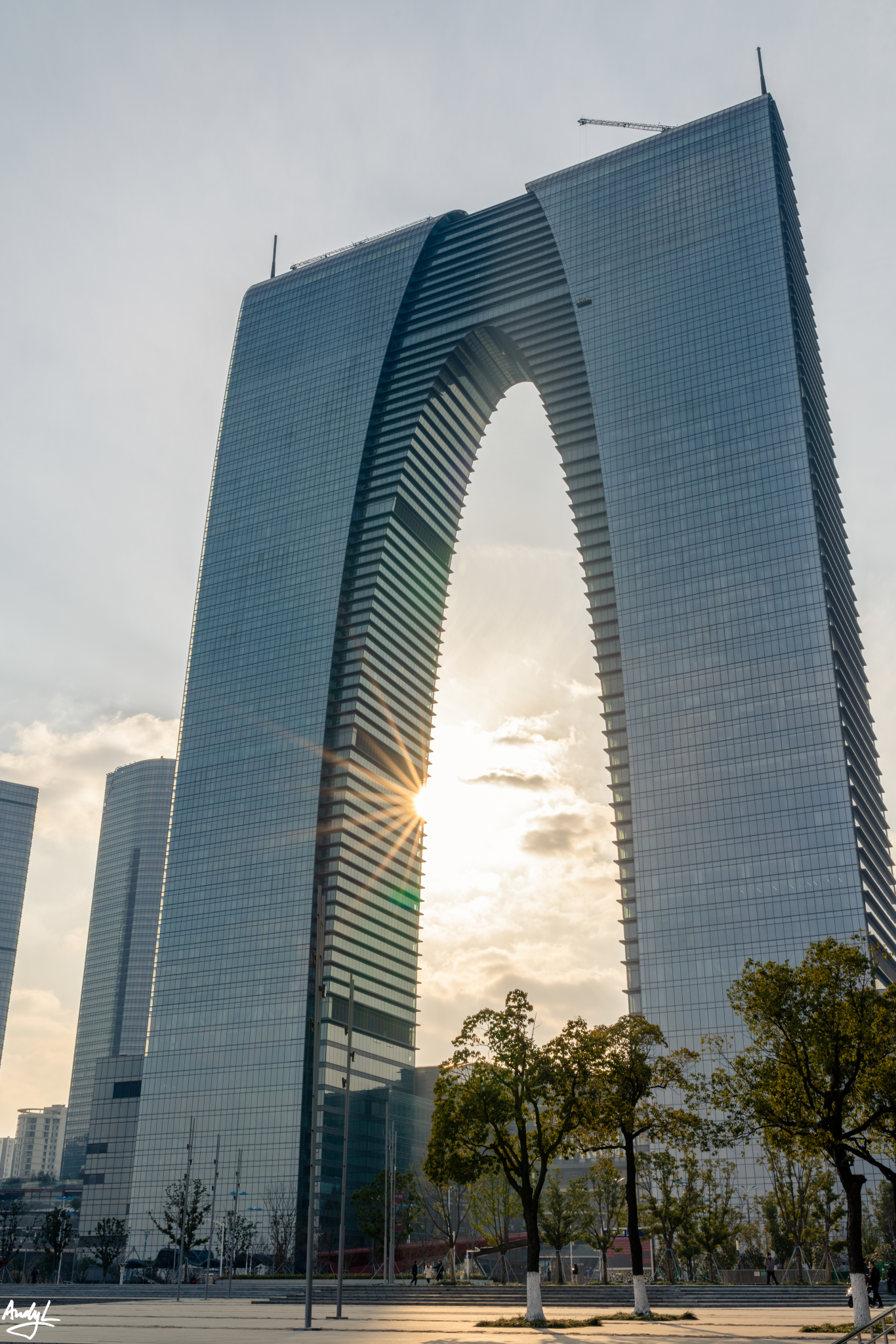 东方之门是金鸡湖畔最显眼、最特别的建筑,从修建起就得到了极大的关注,由于顶部独特的连体结构,它被网友戏称为“秋裤大楼”。