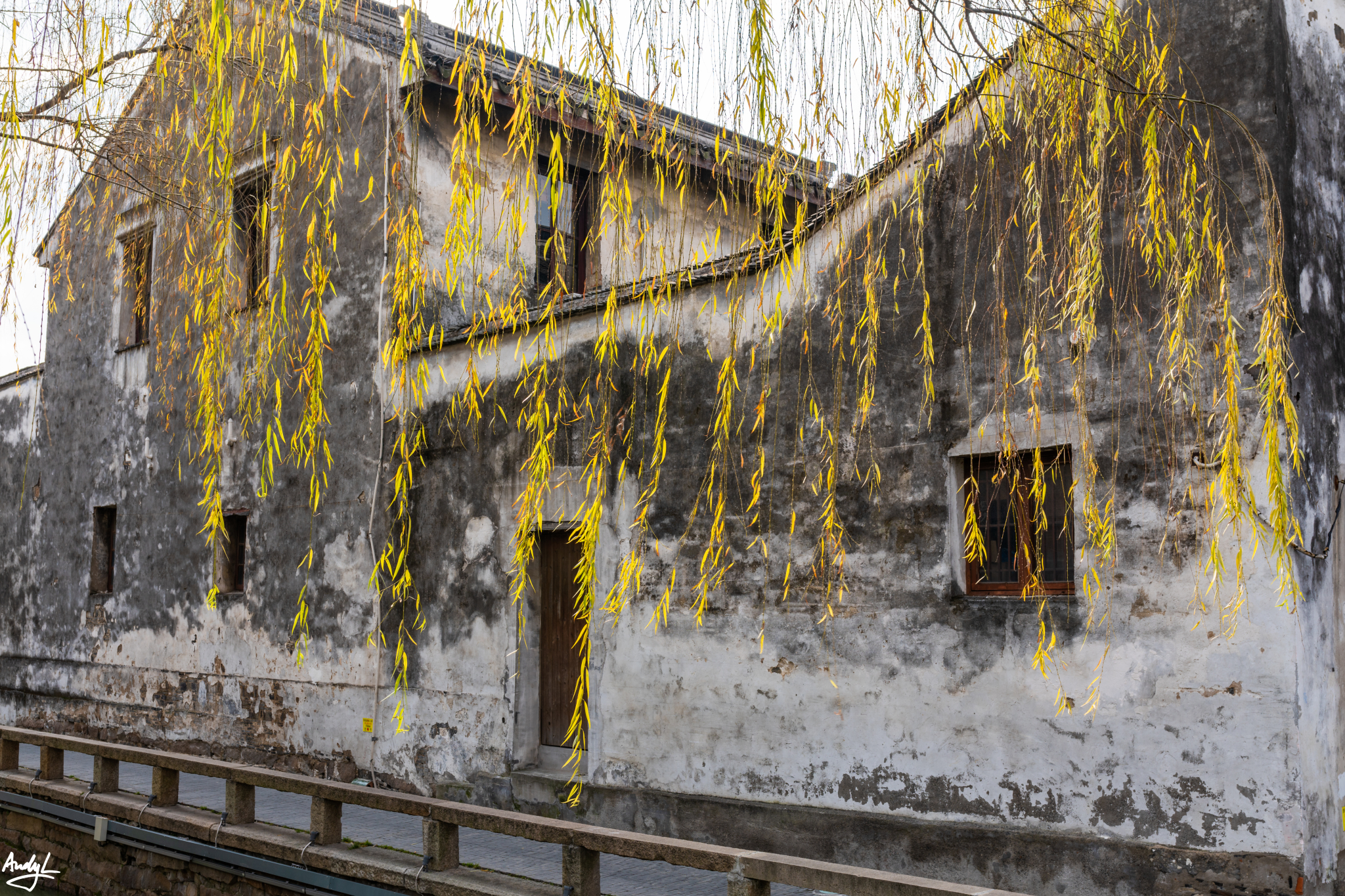 午后的阳光,将柳叶照得通透,搭配上老房民居,比起河对岸的店铺成群,这才是传统水乡原本的样子。
