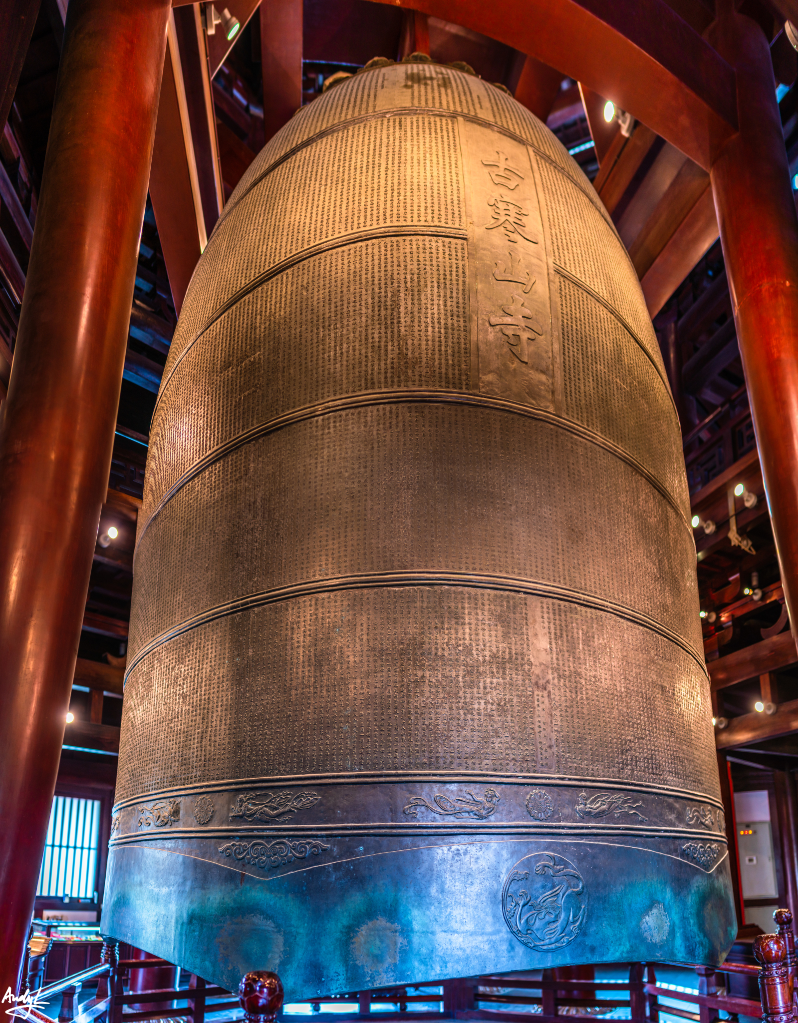 走进阁内,里面藏了一口大钟,说实话,第一眼看到这钟的时候确实比较震惊,因为我从来没有见过如此巨大的铜钟。据说这钟有108吨重,被载入了吉尼斯世界纪录。钟的外壁上刻有《大乘妙法莲华经》