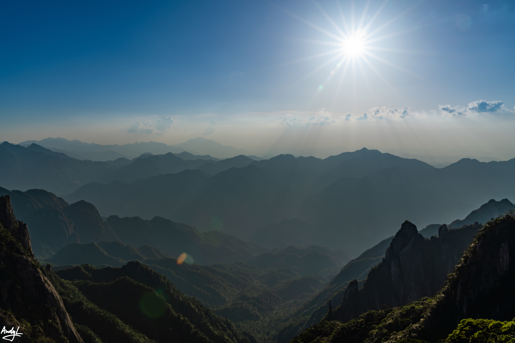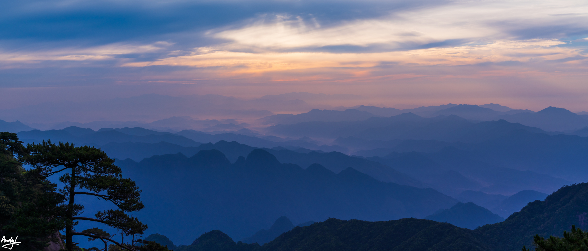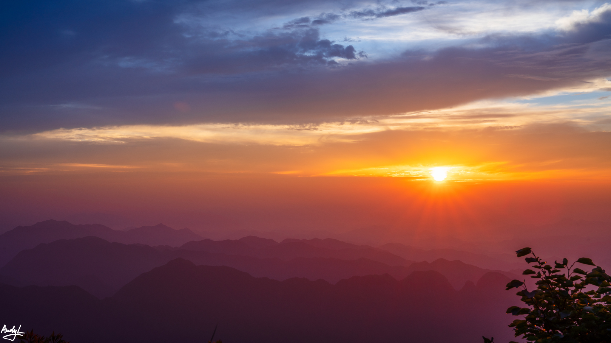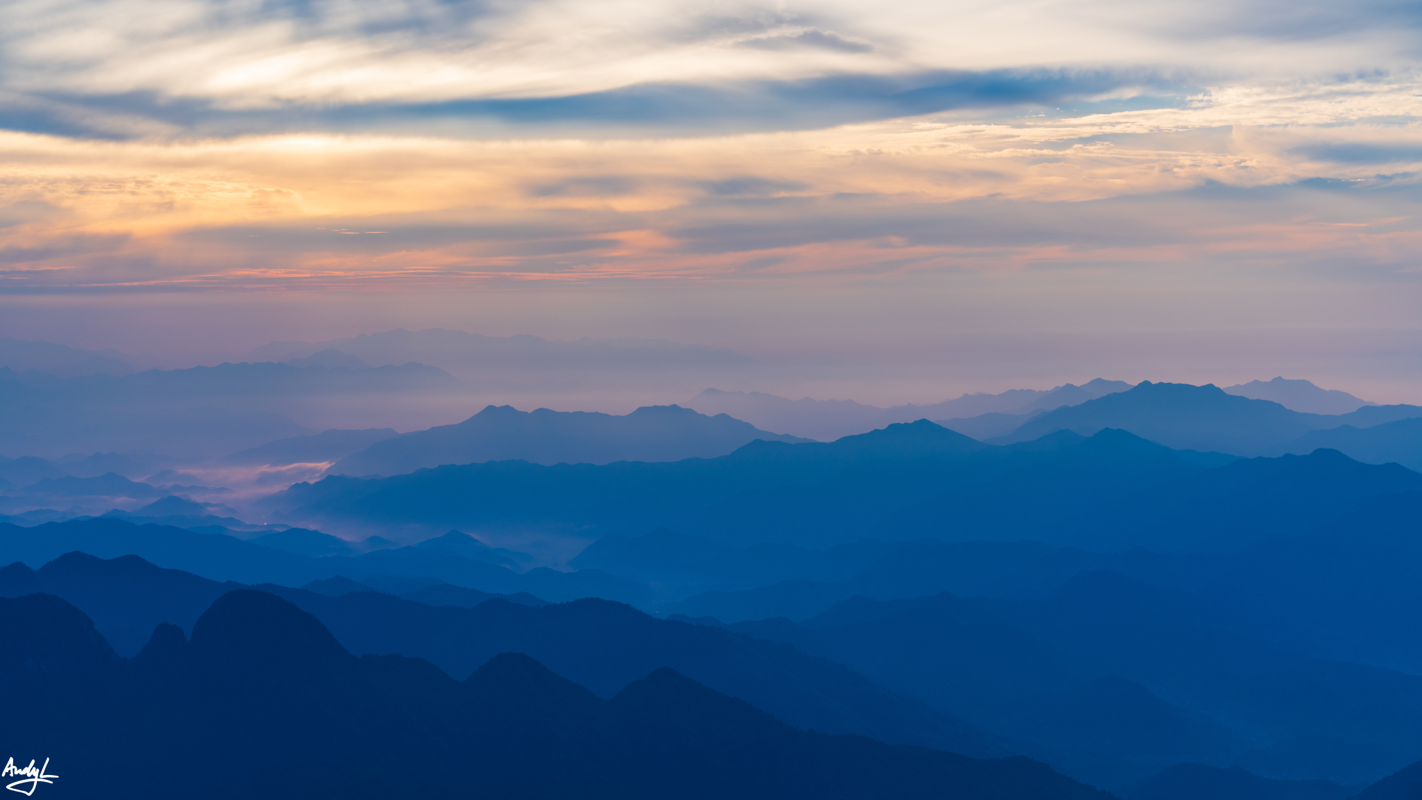 随着高度不同,阳光折射出的颜色也不尽相同,远山的颜色逐渐变淡,显出了一些紫色。